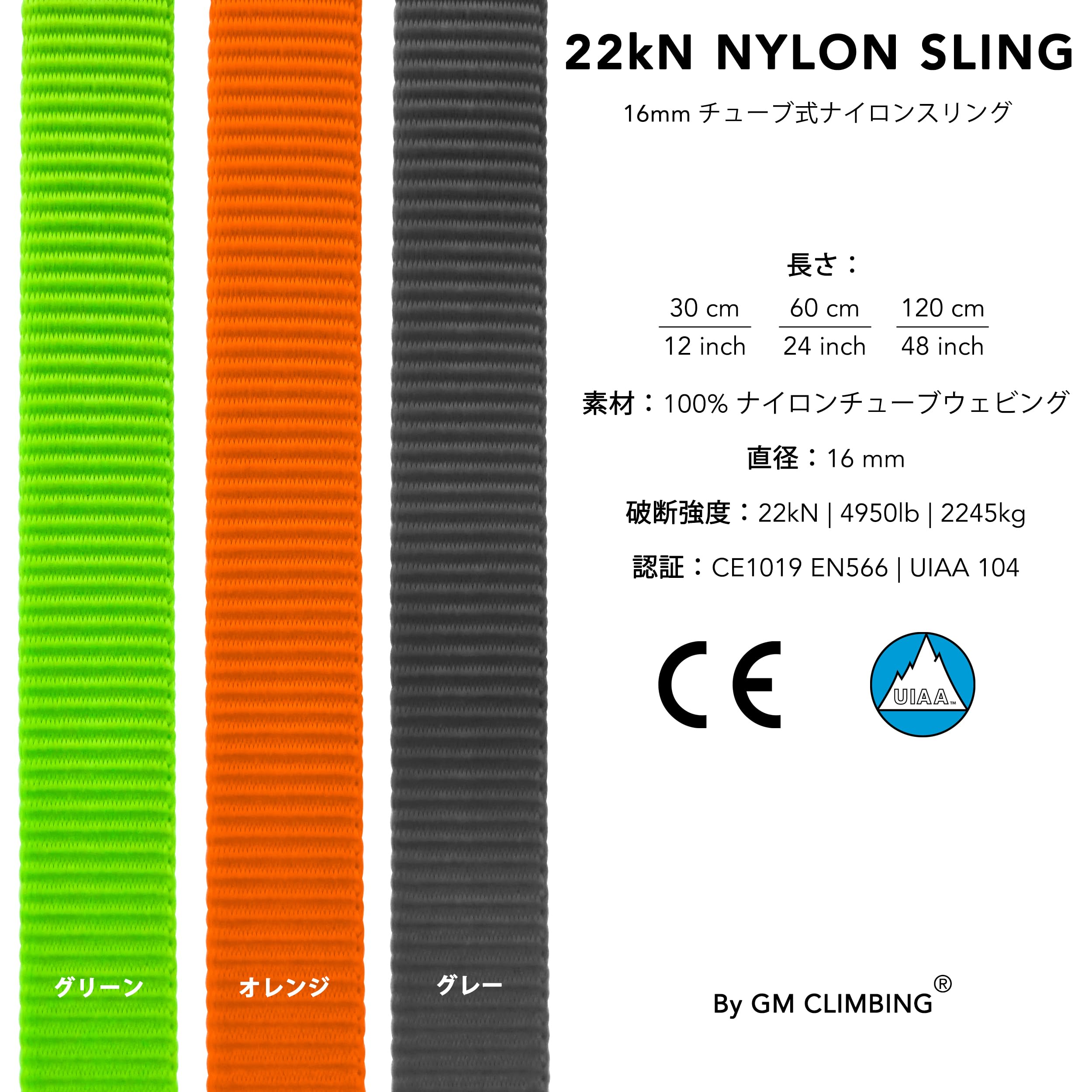 16mm ナイロンスリング 登山 クライミング用 スリング ランナー アウトドア ビレイ レスキュー ツリークライミング 長さ 30cm / 60cm / 120cm 3サイズあり