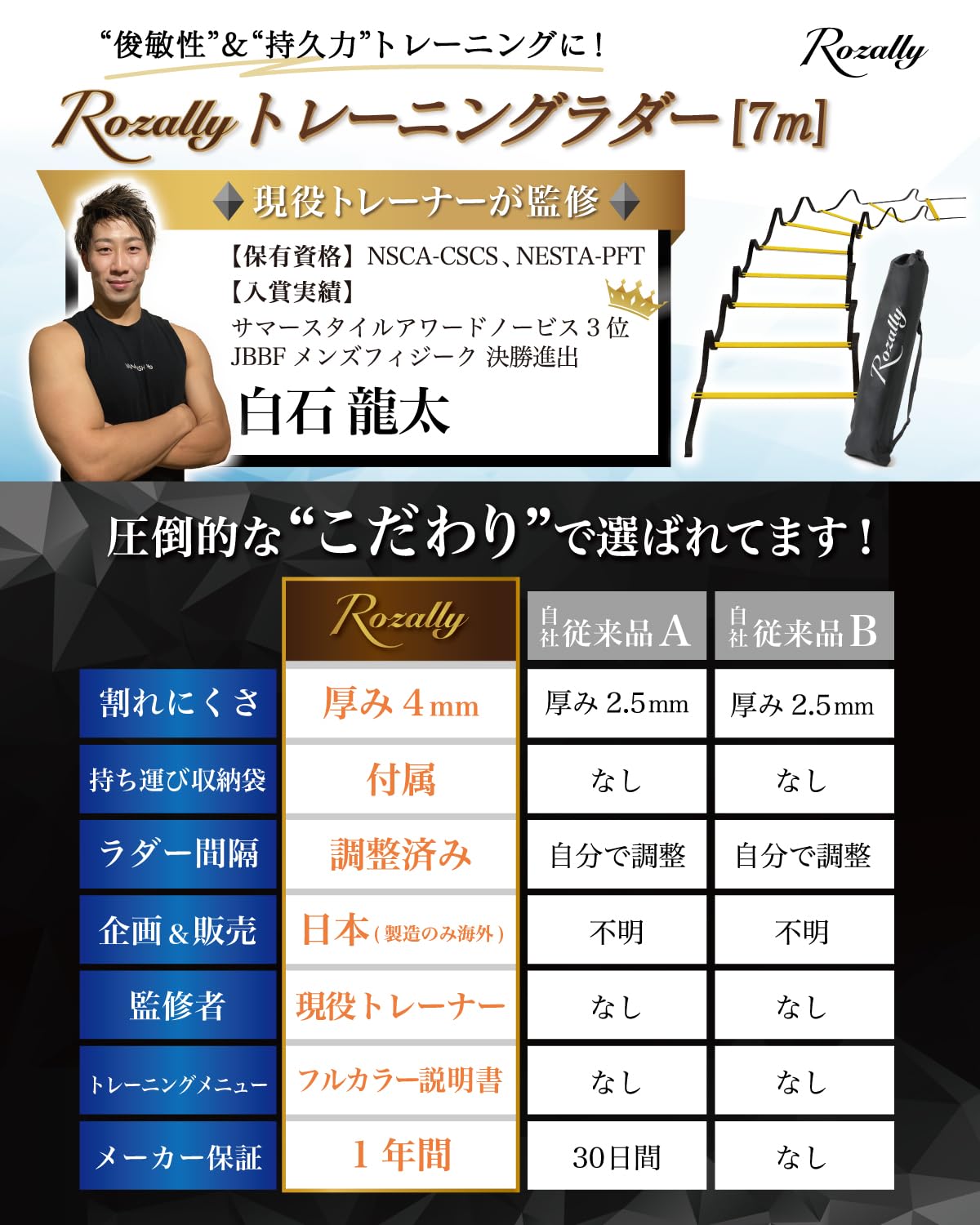 商品情報商品の説明主な仕様 【現役トレーナーが監修】 瞬発力 を 鍛える ために企画&開発された トレーニングラダー です。細かな ステップ や 敏捷性 などを向上するために考案して生み出した” トレーニング ラダー”。本製品では 男性 や 女性 に問わず 初心者 の お客様に1500人以上に トレーニング の指導実績を持つ【現役トレーナー】の先生からアドバイスをもらい、分かりやすい取扱説明書を添えて企画&開発しました。br【こだわり】様々なメーカーから 俊敏性 の トレーニング 用品として” トレーニングラダー ”が販売されていますが、Rozallyの トレーニングラダー は”こだわり”が一味違います。 陸上競技 や 練習用品 のアイテムをメインに取り扱っている10社以上の工場からサンプルを取り寄せ、「プレートの耐久性」や「持ち運び の コンパクトさ」を一緒に試行錯誤して頂けた1社に絞って発注を行なっています。br【様々な競技に】 「キレのある動き」や「足元の細かなコントロール」という点で、 ラダートレーニングは様々なスポーツで採用がされています。「サッカー」 「フットサル」 「バスケット」 「野球」 「陸上」 「剣道」などとても幅広くご愛用頂いております。小学生 の チームスポーツなど 子供 の 競技でもご活用頂いております。br【フルカラー説明書が付属】 ラダートレーニングは初心者メニュ~経験者メニューなど、様々なバリエーションがあります。また動きも多彩に組み合わせることで「敏捷性」や「俊敏性」の向上に大きく役立ちます。弊社のトレーニングラダーには初心者やお子様でも取り組みやすいよう、専門家が監修した13種目のメニューを付属させて頂きました。br【製品の長期保証】 Rozallyトレーニングラダー は品質にこだわり、工場と交渉をおこなって素材選定から進めています。出荷前の検品などは十分に行わせて頂いているのですが、輸送中に破損や汚れの付着など稀に発生してしまうケースがあります。不具合などが発生してしまった場合でも、製品には1年間の長期保証を付属させて頂いておりますので、すぐに交換品の手配をさせて頂きます。また万が一の不具合に関しては、”開封後”でも”使用済み”でも全額の返金保証を付属させて頂いております。