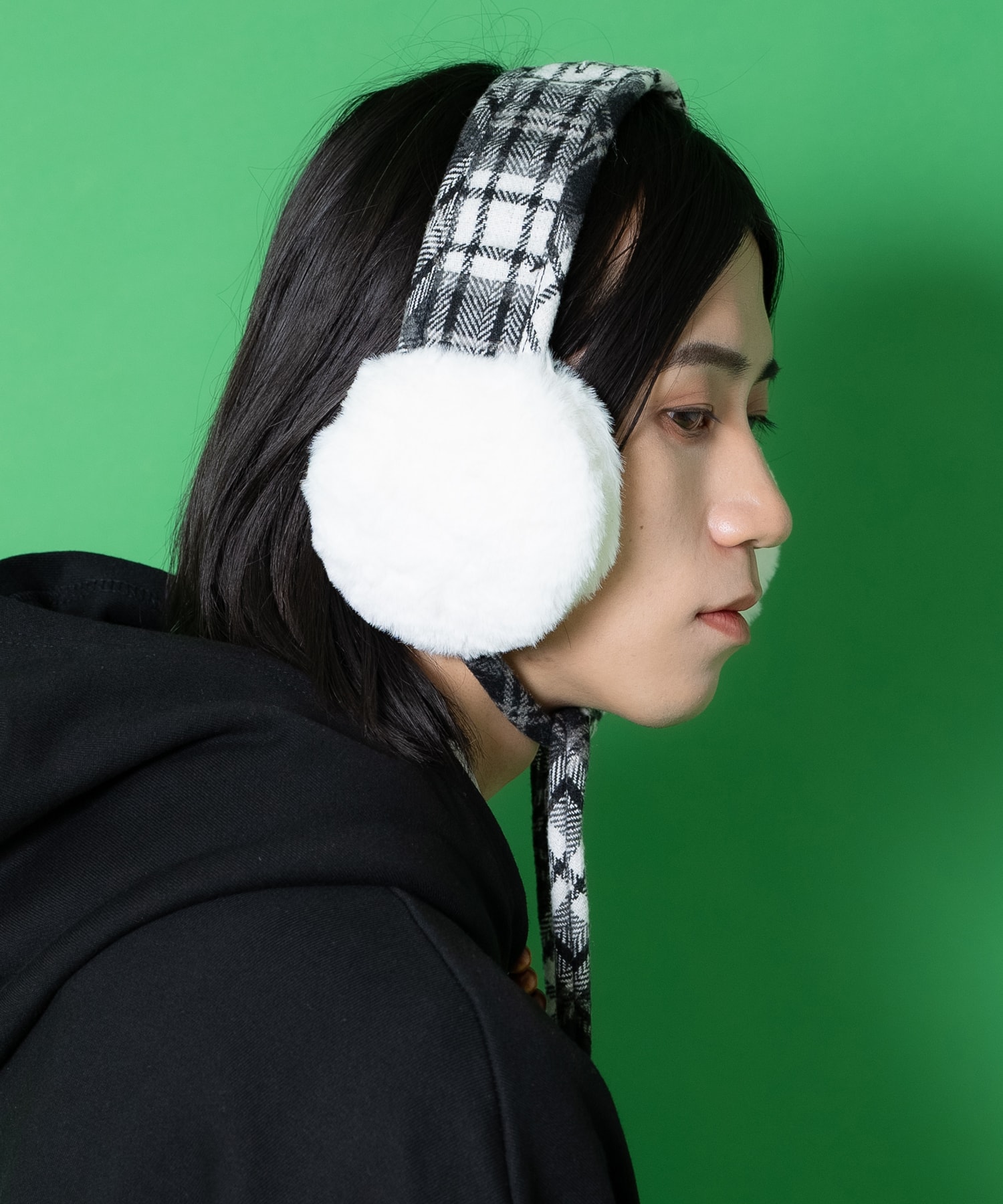 起毛肉厚ネルチェック柄ショートファー切替イヤーマフ (別売りハンチング取付可) / ユニセックス 耳当て ヘッドドレス ボンネット
