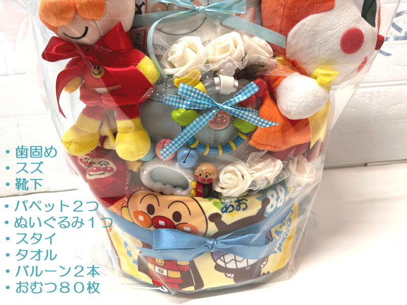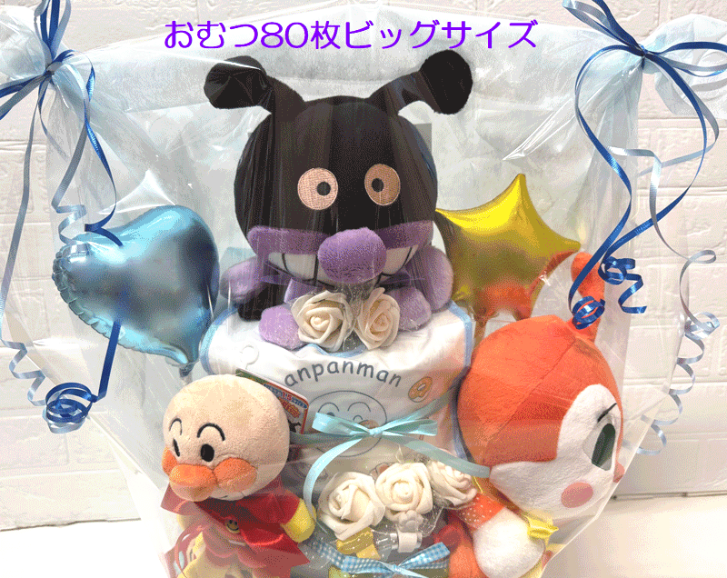 人気のアンパンマンのおむつケーキです!! ご出産祝いにもピッタリ♪ タオル、歯固め、おもちゃ、ぬいぐるみ、パペット がついた商品のおむつケーキです!! タオルには名入れ無料です。 【おむつケーキのセット内容】 ○タオル1枚 ○はがため 赤ちゃんがカミカミしやすく、持ちやすいサイズのはがため。真ん中のアンパンマンがくるっと回って表情が変わる歯固めです。持ちやすく、噛みやすいサイズです。 ○ベビーベル ふると優しい音色がします。 ○アンパンマンぬいぐるみ○バイキンマンとドキンちゃんのパペット 【おむつについて】 おむつブランド:パンパース おむつサイズ :S(4〜8kg) おむつ枚数 :80枚 ケーキサイズ :直径約35cm×高さ約50cm 無料のメッセージカードもあり、 ご希望のメッセージを入れることが可能です。 ※送料無料ですが、 北海道、沖縄、離島につきましては、 別途送料2000円をご負担頂きますので予めご了承下さい。バイキンマン おむつケーキ