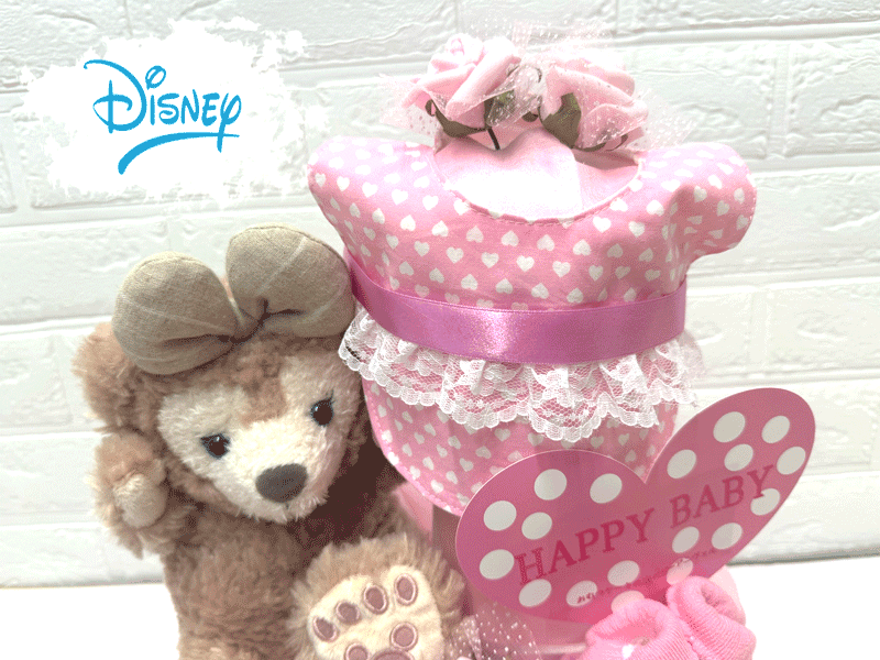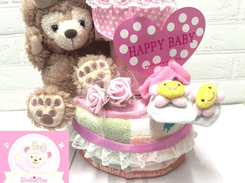 人気のダッフィー、シェリーメイ、ジェラトニ-、ステラ・ルー、リナ・ベールのおむつケーキです!! ご出産祝いにもピッタリ♪ スタイ、パペット、タオル付きのおむつケーキです!! タオルとスタイに名入れ刺繍は有料です。 【内容】 ○パペット1つ○ベビー靴下1足 ○スタイ1枚オーガニックコットン&2重ガーゼになります○タオル1枚○お花2つ○レース&リボン【追加オプション】歯固め有料+1300円です。 【おむつについて】 おむつブランド:パンパース おむつサイズ :S(4〜8kg) おむつ枚数 :30枚 ケーキサイズ :直径約25cm×高さ約38cm 無料のメッセージカードもあり、 ご希望のメッセージを入れることが可能です。 ※双子ちゃん用に送りたいというお客様は 備考欄に記載いただけましたら、対応させて頂きます。(別途追加料金が発生します。) または、当店に直接お問い合わせください。 ダッフィー、シェリーメイのおむつケーキ♪