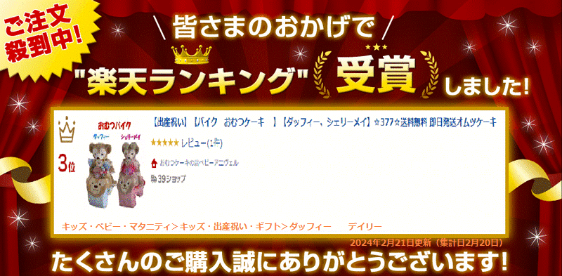 【出産祝い】【バイク おむつケーキ 】【ダッフィー、シェリーメイ】☆377☆送料無料 即日発送オムツケーキ