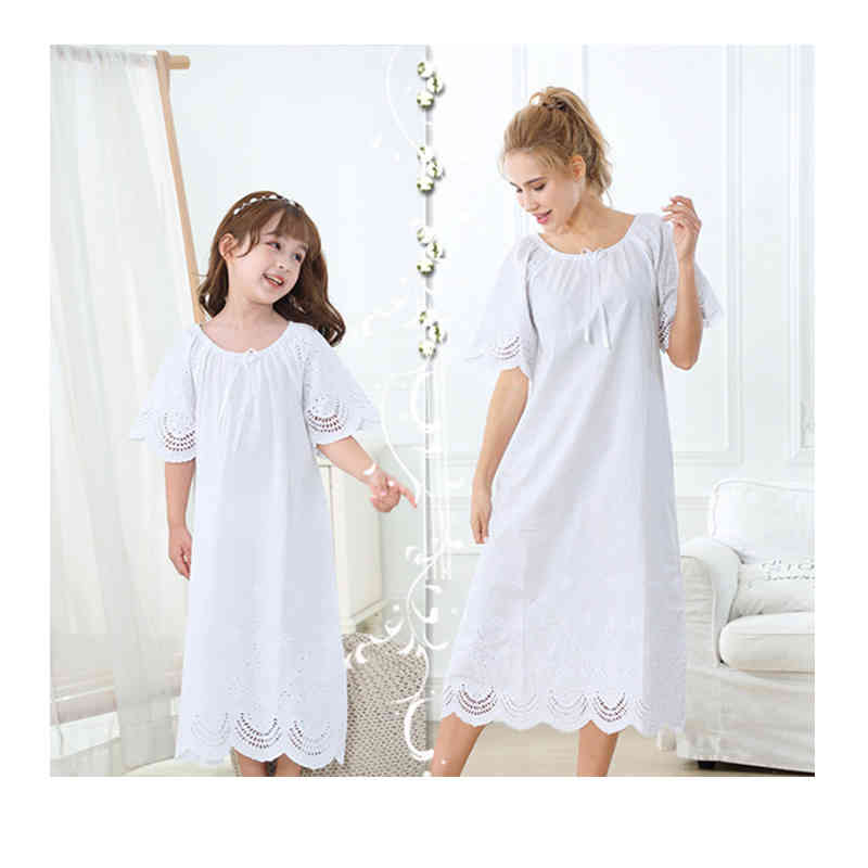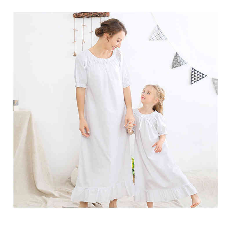 パジャマ ワンピース ロング丈 半袖 ナイトドレス 女の子 親子 レディース ママ 綿 丸首 ルームウェア 子供服 寝間着 保育園 女児 部屋着 無地