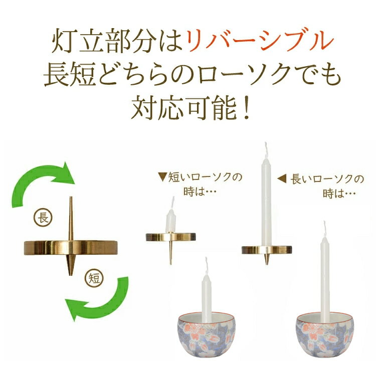 仏具の基本となる「花立」「「香炉」「灯立」 これを三具足といいます。灯立は、「灯明」をお供えするために欠かせないお道具のひとつです。こちらの「灯立」は、長短両方のローソクに対応できるリバーシブルになっています。 「雅桜」は、モダンな仏壇やミニ仏壇にもマッチする華やかで上品な桜の柄の陶器仏具です。 佐賀県有田町を中心に焼かれる陶器であります有田焼(ありたやき)。その有田焼の技術と和紙の素材を使って焼かれた高級感溢れる具足です。 セット品もあります。他のお道具と合わせればトータルコーディネートも可能です。 商品名 : 有田焼「天音(あまね)」 雅桜 灯立〔ブルー〕 材質 : 陶器製 商品サイズ : 上径45mm×下径25mm×高さ33mm有田焼(ありたやき)は、佐賀県有田町を中心に焼かれる陶器です。 有田焼の技術と和紙の素材を使った高級感溢れる具足です。 「花立」 「灯立」 「香炉」 が最低限必要なお道具で 「灯立」は、灯をお供えするために欠かせないお道具です。 こちらは灯立の単品ページですが 寝かせる線香皿・花立・灯立・茶湯器・仏器がセットされた5点セットです。 同じ柄の具足と組合わせてコーディネートもできます。 花立 寝かせる線香皿 茶湯器 仏器(仏飯器)