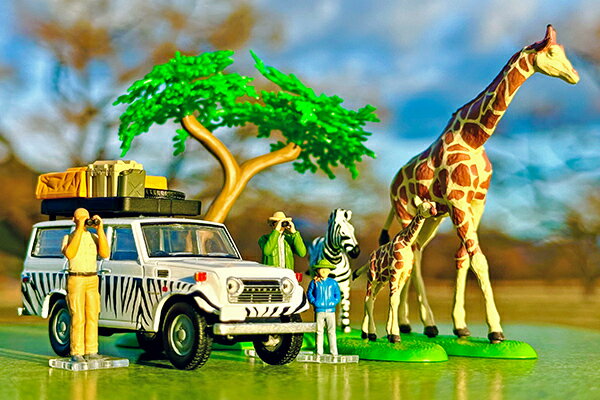 1/64スケール 【材質】 本体:亜鉛合金 タイヤ:PVS シート:PP シャーシ/ホイール/グリル:ABS ライト/窓ガラス:PS ※創りこみ重視の為、ドア開閉アクションはございません。 発売元:トミーテックアフリカの「サファリ」をテーマにしたフィギュア・小物のセット。 キリン、シマウマ、ツアーガイドと観光客、アカシアの木などが付属します。 ランドクルーザーのルーフキャリアにはスペアタイヤ、ジェリカンなどを載せることができ、 サファリの雰囲気がより一層高まります。 立ち姿の人のフィギュアには、自立させるのに便利な台座がそれぞれ付属するのでお手軽に並べて楽しめます。 【セット内容】1.トミカリミテッド ヴィンテージ トヨタ ランドクルーザー FJ56V型 (キャリア付)、2.キリン(親) 、3.キリン(仔) 4.シマウマ、5.ツアーガイド、6.観光客(親)、7.観光客(子)、8.収納ボックス、9.スペアタイヤ、10.ジェリカン、11.アカシアの木 最近、SNSでにわかに盛り上がっている、ミニカーやトイを使った「映え」写真。単に撮影するだけでなく、 フィギュアや情景アイテムと組み合わせるなど、いろいろな工夫を楽しむ人たちが増えています。 そこでトミーテックが提案するのが、1/64スケールのジオコレ64 #カースナップです。 今回は、アフリカの「サファリ」をテーマとしたフィギュア・小物のセットです。 トヨタ ランドクルーザーのミニカーが専用カラーで付属します。 海洋堂より生物造形の第一人者「松村しのぶ」氏が動物フィギュアを監修。 生き生きとした動物たちが1/64スケールで登場。ツアーガイドと観光客は遠くからキリンとシマウマの様子を 窺っていたりと、アフリカのサファリを中心とした様々な情景が楽しめます。 クルマとその周辺が映える写真をSNSに投稿して、#カースナップや#TLVを盛り上げましょう。 ※写真の一部は「海洋堂×トミカリミテッド ヴィンテージ ジオコレ64 #カースナップ29a サファリ2」(別売)を組み合わせた例です。 ※路面は、付属しません。
