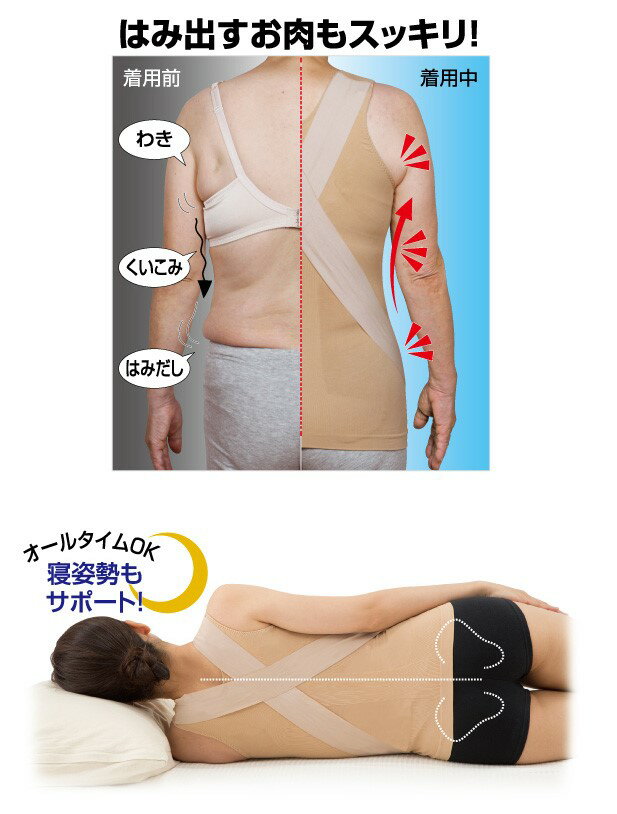 品名:たすきベルトインナー姿勢ビシット 素材:身生地:ナイロン91%、ポリウレタン9% ベルト:ナイロン78%、ポリウレタン22% サイズ(cm):M〜L:バスト79〜94cm L〜LL:バスト86〜101cm 生産国:日本製整体師が考案!「たすき掛けベルト付き」極薄のびのび着圧インナー。 和服のたすき掛けを極薄ベルトで再現した姿勢補整インナー。 たすき掛けベルトが、丸まった肩・背中・腰をビシッと伸ばして姿勢を美しく。 インナーの着圧効果で、たるんだお肉をスッキリ引き締めます。 脇や体を締め付けないので、動きやすく1日中ラクラク。インナーを1枚着るだけで姿勢もボディラインも美しく。