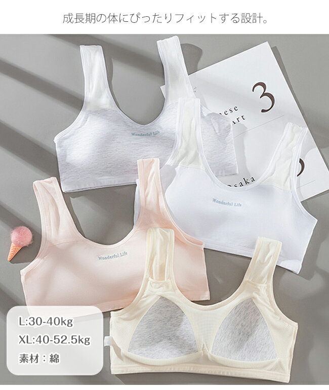 【商品名】 ★ジュニアブラ インナー 青春期 女の子用★ 【商品情報】 ・カラー:ホワイト ピンク ベージュ グレー ・サイズ:L XL ・素材:綿 成長期の体にぴったりフィットする設計。 小学生や中学生、日常使いや初めてのブラとして安心の選択です。 薄手のTシャツの下でも目立ちにくく、肌への刺激を軽減する柔らかい素材を使用。 中学生 下着 女の子として普段使いや部活動にぴったりです ノンワイヤー構造で圧迫感ゼロ: ノンワイヤー設計により、締め付け感を抑えながら自然なフィット感を実現 ★モデルに使用している小物、アクセサリ等はセット内容に含まれません。 ★平置き実寸にて測っております。採寸方法により若干の誤差が生じる場合がございます。 ★モニターの発色具合によって実際のものと色が異なる場合があります。 何卒、ご理解くださいますよう、お願い申し上げます。