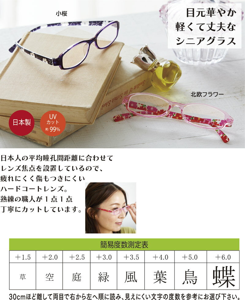 目もと華やか!軽くて丈夫なシニアグラス 日本人の平均瞳孔間距離に合わせてレンズ焦点を設置しているので 疲れにくく傷もつきにくいハードコートレンズ。 熟練の職人が1点1点丁寧にカットしています。 紫外線を約99%カットする機能性にもご注目。 ◆素材 レンズ:プラスチック フレーム:ポリアミド樹脂 ◆サイズ(約:単位cm) 約幅13.5×高さ3×テンプルの長さ14.5 ◆その他 ソフトケース付き 第3種医療機器製造販売業許可番号27B3X00134 UVカット約99% 重さ約15〜27g(レンズの重さによって異なります) {関連検索キーワード} メガネ 眼鏡 シニアグラス 老眼鏡 拡大鏡 見えやすい UVカット 紫外線カット おしゃれ お洒落 軽量目もと華やか!軽くて丈夫なシニアグラス 日本人の平均瞳孔間距離に合わせてレンズ焦点を設置しているので 疲れにくく傷もつきにくいハードコートレンズ。 熟練の職人が1点1点丁寧にカットしています。 紫外線を約99%カットする機能性にもご注目。 第3種医療機器製造販売業許可番号27B3X00134