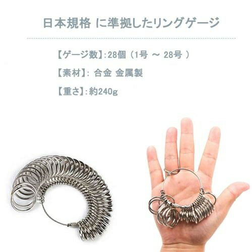 商品仕様素材: 合金 金属製、 重さ:約240g。 (ゆびわクロス付き) 指輪さいず計測用日本標準規格 1号〜28号まで測定可能。 リング購入のマストアイテムネット通販などで指輪(リング)を購入したのに、サイズが合わなかった経験はありませんか?そんな時にお勧めのアイテム。このリングゲージさえあれば、自分で指のサイズを簡単に測ることができます。日本規格に準拠したリングゲージで、 1号〜 28号まで全てのサイズを測定することができます。 ギフト&プレゼントにも最適アクセサリー屋の店員さんがよく腰につけているタイプのリングゲージです。 ネジ脱着式のワイヤーに束められていますので、簡単に各サイズのリングを外して計測できます。アクセサリー好きなら1個は持っておきたいマストアイテムです。 測定時のご注意リングゲージ 自体の重さで指とゲージの間に隙間ができ、実際の サイズ より緩くなる場合があります。測定時には、ワイヤーから外すか手のひらに接地させてお測り下さい。指輪を着ける指の腹より第二関節が太い方は、関節が無理なく通るサイズが適正なサイズとなります。体調などで指のサイズが変化することがございますので、朝夕それぞれ1回ずつ測定してください。