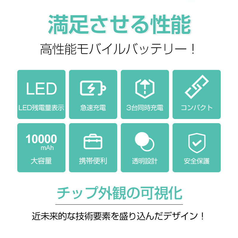 モバイルバッテリー 10000mAh 大容量 22.5W PD 20W iPhone 17シリーズ 急速充電 防災電源 透明設計 急速充電 3つ出力ポート 3台同時充電 急速プロトコル対応 軽量 コンパクト 持ち運び便利 キャビンに持込可能 Type-C出力/入力 USB-A出力*2 【PL保険加入済み製品・安心】