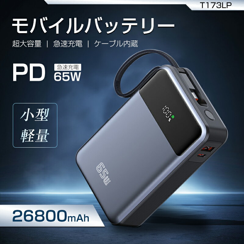 メーカー希望小売価格はメーカーサイトに基づいて掲載しています -製品詳細- 品名 モバイルバッテリー 製品説明 【超急速・3台同時充電】 一体型のType-Cケーブル(PD65W対応)を備えており、USB出力ポート(22.5W)、Type-C出力ポート(65W)、そしてType-C入力ポート(45W)も搭載され、最大3台のデバイスを同時に充電可能です。スマホやノートパソコン、タブレットの急速充電をサポートするのはもちろん、小電力モードも搭載で、イヤホンやスマートウォッチなどの小電力デバイスの充電も対応します。この一台だけで、出張中や旅行中にもコンセント不要で、効率よく充電できます。 【大容量&コンパクト】 26800mAhの大容量で、iPhone 16を約4.5回フル充電できます。互換性も高く、旅行や出張など電源の取りにくい環境でもバッテリー切れの心配がありません。さらにコンパクトにデザインされ、わずか347gの重さで、カバンやポケットに入れても、重量感をかけず、持ち運びに超便利です。外出にしても気軽に充電でき、快適なデジタルライフを楽しめます。 【大画面のバッテリー残量表示】 LCDディスプレイが搭載されており、残量を直接パーセントで表示でき、電力消費量もより具体的な情報を提供し、事前にモバイルバッテリーを充電する際などに便利です。特に外出先での使用においては、どれだけバッテリーが残っているのかをすぐに知ることで、どのデバイスを優先して充電するかといったことも検討することができます。 【その他の特徴】 1、付属のType-Cケーブルを収納するとストラップに変身! 2、質感のあるPCシェルを採用、汚れがあってもお手入れが簡単。 3、汎用性高く、スマホやタブレットの各機種に完全対応。 4、過圧保護/過電流保護/短絡保護など多重安全保護付き。 5、PSE安全認証済み、安心して持ち歩くことが可能。 【カラー】グレー 【パッケージ内容】モバイルバッテリー本体、充電ケーブル(Type-C TO Type-C)、取扱説明書。 【主な仕様】 品名:モバイルバッテリー 型番:T173LP サイズ:108*68*32.5mm 容量:26800mAh 電池タイプ:ポリマーリチウム 素材:ABS+PC Type-Cケーブル出力:5V-3A/9V-3A/12V-3A/15V-3A/20V-3.25A(65W) Type-C出力ポート:5V-3A/9V-3A/12V-3A/15V-3A/20V-3.25A(65W) USB出力ポート:5V-3A/9V-2A/12V-1.5A /10V-2.25A (22.5W) Type-C入力ポート:5V-3A/9V-3A/12V-3A/15V-3A/20V-2.25A (45W) Type-Cケーブル入力:5V-3A/9V-3A/12V-3A/15V-3A/20V-2.25A(45W) 総出力:5V-3A MAX 【PL保険加入済み製品・安心】 本製品はPL保険(製造物責任保険)加入済みで、万が一のトラブルや事故にも対応できる安心設計です。「PL保険付きで安心」「PL保険加入済み製品」「万が一にも備えるPL保険対応」の三つの安心要素を備えており、お子様から高齢者までご家族全員が安全にご使用いただけます。品質と安全性を第一に考えたものづくりを心がけており、信頼できる製品として自信を持ってお届けします。購入後のアフターケアも充実しているので、初めての方にもおすすめです。 PSEマークの取得に必要な技術基準に適合しております。 届出事業者名:明誠株式会社 PSマークの種類:PSE 【安全上のご注意】 ・異常な発熱を感じた場合は、直ちに使用を中止し、安全な場所に置いてください。 ・発煙・異臭・膨張・異常な発熱が見られた場合は、充電を中止し、使用しないでください。 ・高温・直射日光・車内などの密閉空間での使用や保管はお避けください。 ※本注意事項は、リチウムイオン電池を使用した製品に共通する一般的な内容です。> 【関連キーワード】 モバイルバッテリー 26800mah 大容量 軽量 コードレス 薄型 急速充電 iphone スマホ充電 type-c 蓄電対応 より増量 コンパクト 残量表示 おしゃれ おもしろ 可愛い ストラップ付き コンセント 車 コード シンプル 高級感 持ち運び ケーブル付き 蓄電 モバイル ドコモ ipad充電器 iPhone 17シリーズ air iPhone16 16pro 16promax iPhone15 iPhone15Pro iPhone15ProMax iPhoneSE2 アイフォン8充電器 アイパッド スマートフォン iphone6s アイホン6s充電器 iphone7充電器 外出 plus 6s 5 SE GALAXY Xperia スマホ充電 AQUOSスマホ Google携帯電話充電 Samsung Galaxy 充電 荒野行動などゲーム時の充電切れを解決 mobilebattery ポータブル 充電器 powerbank 小型 災害 防災セット 防災グッズ 防災 防災用品 防災対策 備蓄 サブバッテリー タフ 悪環境 地震 洪水 過酷な環境 アウトドア サバイバルグッズ 車中泊グッズ アンドロイド android apple watch イヤホン かわいい iphone8 急速充電器 超軽量 スマホ充電器 台風 グッズ 電熱ジャケット 電熱ベスト 電気毛布 対応 台風対策 持ち込み PSE認証済 緊急用必携品 敬老の日 おすすめ お歳暮 2026最新版 父の日 父の日ギフト 母の日 母の日ギフト 御中元 お中元 送料無料