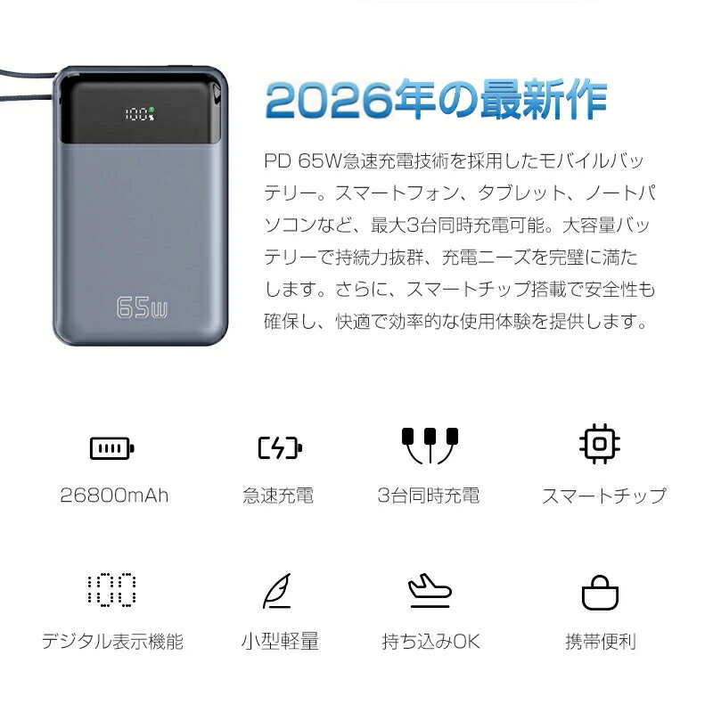 【2026年新モデル】モバイルバッテリー 26800mAh 99.16Wh 大容量 急速充電 軽量 ケーブル内蔵 3台同時充電 パワーバンク Type-C出入力 USBポート 持ち運び便利 PD/QC3.0対応 PD65W iPhone 17シリーズ対応 iPhone16 15充電器 ノートパソコン充電 【PL保険加入済み製品・安心】