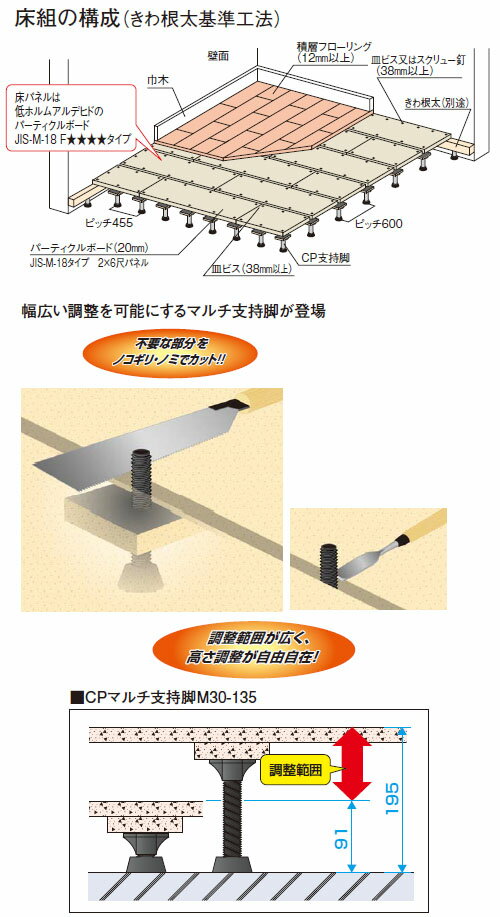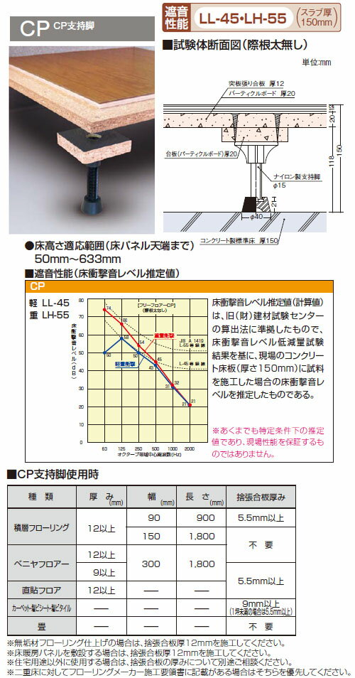 特徴ワンランク上の快適性を追求した、乾式二重床システム「フリーフロアー」「安心」「省力」「高耐久」3つのメリットで、多彩なニーズの施工をサポート。遮音性能を更に強化し、床高調整範囲を大幅に拡大。画期的な工法により、短工期でフロアーを構築します。配管・配線が自由自在、メンテナンスが可能。床先行工法にも対応してトータルコストを削減。低ホルムアルデヒド対応で、シックハウス対策は万全。仕様CP支持脚・21mmゴム座付汎用最低勘合寸法:15mm調整範囲(mm):215~290中央高さ:252mm※超低床用、汎用CP支持脚はマイナスドライバー8×150、9×200(JIS B 4609 ねじ回し)で調整することができます。※床パネルと支持脚の固定はフレキ付皿ビス(3.8×38mm以上又はパーチ25mm厚の場合は41mm以上)にて固定してください。※超低床用支持脚をご使用の際は必ず半ネジタイプ3.8×38mmのビスで固定してください。※商品画像はCP50203の画像です。メーカーからの直送商品のため、代金引換・後払い決済のお支払いはご利用頂けません。こちらの商品は、システム上、日時指定・時間帯指定を指定してご注文は可能となりますが、日付指定・時間指定をお受けできません。運送会社の都合上の配送となります。また個人宅への配送は承っておりません。必ず配送先に会社名、店舗名をご記入下さい。ご記入がない場合は、ご注文をお受けできません。大型商品につきましては車上渡しになる可能性がございます。マンションなどの階層がある建物は、玄関先などの1階で商品の受け渡しとなります。北海道、沖縄、離島は別途送料がかかる場合がございます。お客様都合によるご注文後のキャンセル、返品、交換はできません。受注後にメーカー在庫を確認いたします。万一、メーカーにて欠品や廃番の場合は商品をご用意できない場合がございます。その場合は、メールにてご連絡させて頂きますので、ご注文後、当店から届くメールを必ずご確認宜しくお願い致します。ご注文はキャンセルさせて頂くことがございますので、予めご了承お願い致します。メーカーからの直送商品のため、代金引換のお支払いはご利用頂けません。北海道、沖縄、離島は別途送料がかかります。ご注文後のキャンセル、返品、交換はできません。