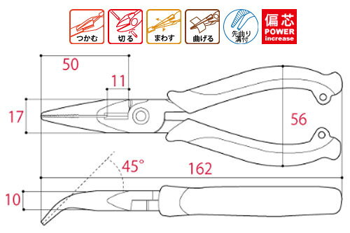 特徴偏芯テコの応用で従来品に比べ、切断力が30%UP。仕様先曲り溝付偏芯POWER increase全長:162mm頭部幅:17mm頭部厚:10mm柄幅:56mm先端長:50mm刃長:11mm曲げ角度:45°重量:140g切断能力:ステンレス1.2φmm、軟鉄線(針金)2.0φmm、銅線2.6φmm、より線2.0平方mm※上記能力以上の対象物を切断しないでください。材質材料:特殊合金鋼焼入れ:刃部高周波焼入れ刃部硬度:56~62HRC柄被覆:エラストマー二重成型グリップ※メーカーからの取寄せ商品のため、ご注文後のキャンセル、返品、交換はできません。
