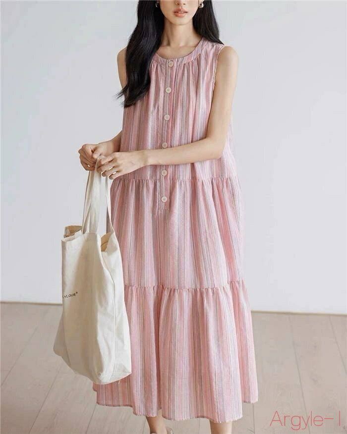 【送料無料】ティアード ワンピース 夏 ロング ノースリーブ レディース ストライプ 総柄 ノースリーブワンピース ロングワンピース 夏ワンピース タンクトップワンピース ロ