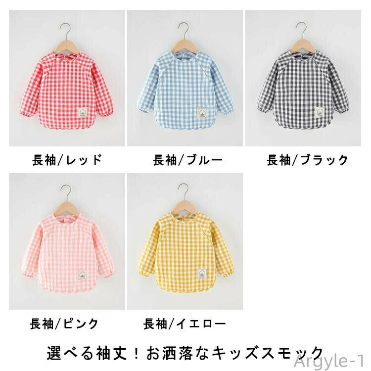 選べる袖丈!お洒落なキッズスモックすっぽり被るだけで可愛く汚れ防止◎お砂場遊び、おゆうぎ、お料理のお手伝い、お絵かきなどいろんなシーンに重宝します。綿混生地なので丈夫で長持ち、どんどん洗濯。通気性にも優れる。薄目のチェック生地ですが、軽くて丈夫です。お洋服のような可愛いデザイン、子供が大好きに間違いなし。お家はもちろん、幼稚園や保育園でも大活躍に間違いなしです。 サイズ 90 100 110 サイズについての説明 表記の通り 素材 綿混 色 半袖/ピンク 半袖/レッド 半袖/ブルー 半袖/ブラック 半袖/イエロー 長袖/レッド 長袖/ブルー 長袖/ブラック 長袖/ピンク 長袖/イエロー 備考 ●サイズ詳細等の測り方はスタッフ間で統一、徹底はしておりますが、実寸は商品によって若干の誤差(1cm〜3cm )がある場合がございますので、予めご了承ください。 ●商品の色は、撮影時の光や、お客様のモニターの色具合などにより、実際の商品と異なる場合がございます。あらかじめ、ご了承ください。 ●製品によっては、生地の特性上、洗濯時に縮む場合がございますので洗濯時はご注意下さいませ。 ▼色味の強い製品によっては他の衣類などに色移りする場合もございますので、速やかに(脱水、乾燥等)するようにお願いいたします。 ▼生地によっては摩擦や汗、雨などで濡れた時は、他の製品に移染する恐れがございますので、着用の際はご注意下さい。 ▼生地の特性上、やや匂いが強く感じられるものもございます。数日のご使用や陰干しなどで気になる匂いはほとんど感じられなくなります。