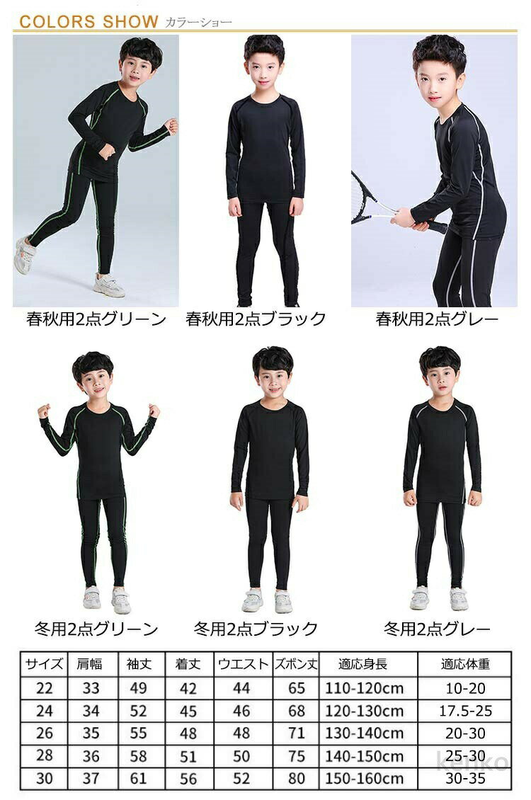110 〜 180cm春秋/冬用 キッズ用コンプレッションインナー上下セット。吸汗速乾、消臭&抗菌の機能を持ち合わせたハイパフォーマンスの機能性が充実。裏起毛と吸湿発熱素材で暖かさを維持して冷えから体を守ます。ストレッチ素材で圧迫感がなく快適!ランニング・トレーニング・野球・ウォーキング・サイクリング・マラソン・サッカー・スキー・スノーボード・サーフィンなど、様々なスポーツシーンでご活用いただけます。 サイズ 110cm/22 120cm/24 130cm/26 140cm/28 150cm/30 160cm/32 170cm/34 180cm/36 サイズについての説明 ※サイズ表の実寸法は商品によって1-3cm程度の誤差がある場合がございます。 素材 ポリエステル 色 春秋用2点グリーン 春秋用2点ブラック 春秋用2点グレー 冬用2点グリーン 冬用2点ブラック 冬用2点グレー 備考 ●サイズ詳細等の測り方はスタッフ間で統一、徹底はしておりますが、実寸は商品によって若干の誤差(1cm〜3cm )がある場合がございますので、予めご了承ください。 ●商品の色は、撮影時の光や、お客様のモニターの色具合などにより、実際の商品と異なる場合がございます。あらかじめ、ご了承ください。 ●製品によっては、生地の特性上、洗濯時に縮む場合がございますので洗濯時はご注意下さいませ。 ▼色味の強い製品によっては他の衣類などに色移りする場合もございますので、速やかに(脱水、乾燥等)するようにお願いいたします。 ▼生地によっては摩擦や汗、雨などで濡れた時は、他の製品に移染する恐れがございますので、着用の際はご注意下さい。 ▼生地の特性上、やや匂いが強く感じられるものもございます。数日のご使用や陰干しなどで気になる匂いはほとんど感じられなくなります。