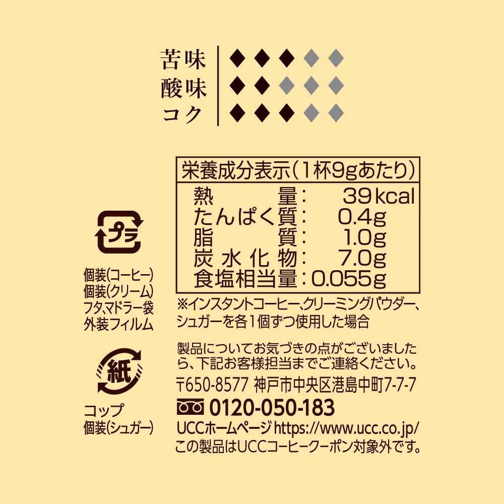どこでも手軽に、ロングセラーの味わいが楽しめるカップシリーズ。お湯さえあればカップで手軽においしいコーヒーが楽しめます。シュガー・ミルクを入れても味わい深く、アウトドアにも最適。※杯数分のシュガー・クリーミー・マドラー付※リニューアルに伴い、パッケージ・内容等予告なく変更する場合がございます。予めご了承ください。●商品サイズ(cm)幅約7.3×奥行約7.3×高さ約13.5●商品重量約0.069kg●商品区分一般食品●原材料●インスタントコーヒー:コーヒー豆(生豆生産国名:ブラジル、パプアニューギニア)●クリーミングパウダー:水あめ(国内製造)、植物油脂、脱脂粉乳、乳たんぱく/pH調整剤、乳化剤●シュガー:原料糖(豪州製造又は国内製造)【1杯9gあたり】熱量39Kcal、たんぱく質0.4g、脂質1g、炭水化物7g、食塩相当量0.055g●アレルギー物質無●原産国:日本(検索用:UCC インスタントコーヒー ザ・ブレンド カップコーヒー フリーズドライ ブレンド 4杯分 手軽 簡単 アウトドア 4901201157523)最強翌日配送対象商品に関するご案内 最強翌日配送対象商品・対象地域に該当する場合は最強翌日配送マークがご注文カゴ近くに表示されます。 最強翌日配送可能なお支払方法は【クレジットカード、代金引換、全額ポイント支払い】のみとなります。 下記の場合は最強翌日配送対象外となります。 ・15点以上ご購入いただいた場合 ・時間指定がある場合 ・ご注文時備考欄にご記入がある場合 ・決済処理にお時間を頂戴する場合 ・郵便番号や住所に誤りがある場合 ・最強翌日配送対象外の商品とご一緒にご注文いただいた場合 ・お届け先住所文字数が40文字以上の場合