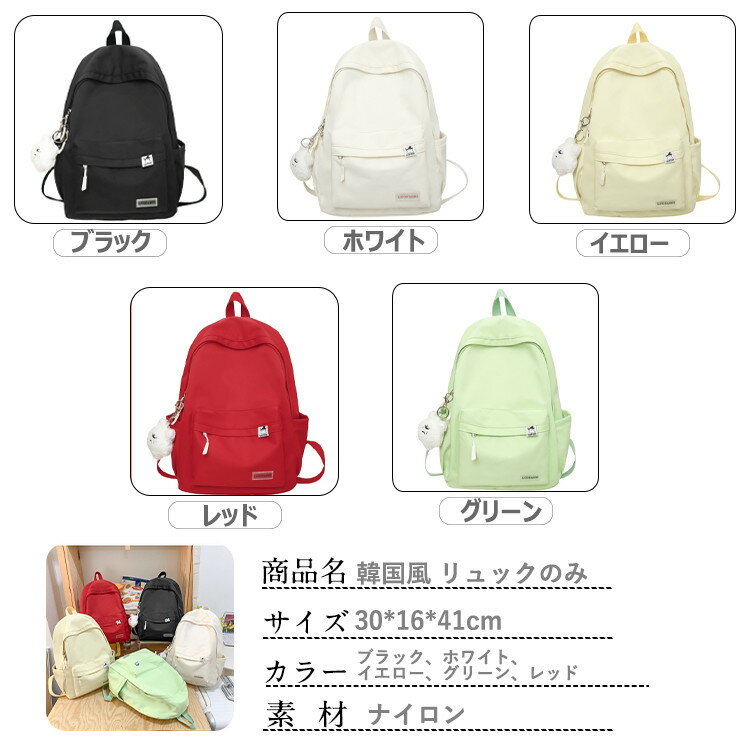 商品の詳細 商品名 リュック カラー ブラック、レッド、グリーン、ホワイト、イエロー サイズ 30*16*41cm 素材 ナイロン 安心保障 ◆7日間!!サイズ・カラー交換OK♪ ・到着日から7日間対応致します。 ・在庫がある商品に限ります。 ・出荷時・返送時送料はお客様負担となります。 ◆7日間!!返品OK◎ ※イメージ違いによる返品も可 ・到着日から7日間対応致します。 ・出荷時・返送時送料はお客様負担となります。 ◆30日間、品質保証!! ・不良品が到着した場合には到着日から30日間対応致します。 ・不良品が到着した場合には到出荷時・返送時送料は弊社負担となります。 ※お客様都合の返品・交換はすべて未使用品に限ります。 ご注意点 ◆商品写真はできる限り実物の色に近づけるよう加工しておりますが、お客様のお使いのモニター設定、お部屋の照明等により実際の商品と色味が異なる場合がございます。 ◆サイズ詳細等の測り方はスタッフ間で統一、徹底はしておりますが、若干の誤差がある場合がございます。 ◆プリント生地の商品については、生地の裁断・縫製方法により写真と同様の柄が出ない場合がございます。 ◆生地の特性上、やや匂いが強く感じられるものもございます。 数日のご使用や陰干しなどで気になる匂いはほとんど感じられなくなります。