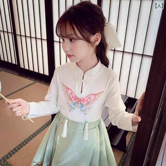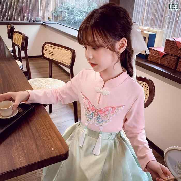 Tシャツ ガールズ 子供服 長袖 春秋 中華風 刺繍 トップス 女の子 カットソー かわいい 吸湿速乾 立襟 普段着 通学着 白 ピンク系