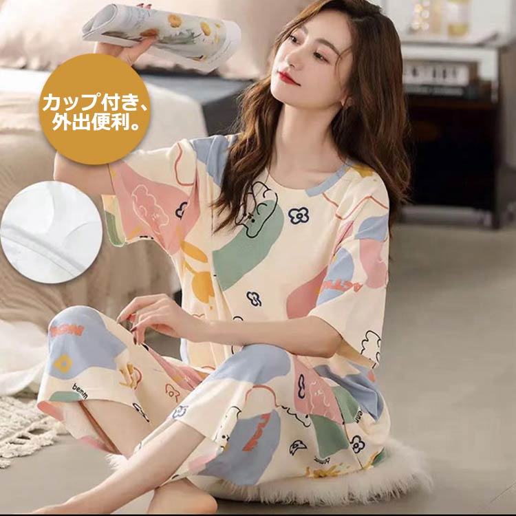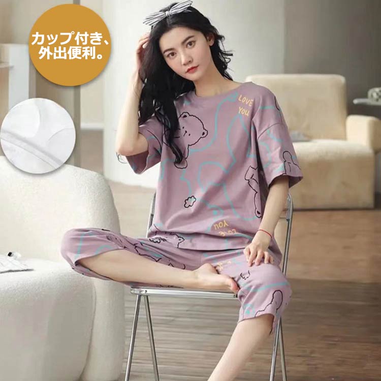 カップ付きパジャマ半袖夏レディースゆったりカップ付きルームウェアパジャマ涼しいレディース薄手ルーズパッド付きゆったり大きいサイズ半袖Tシャツショートパンツ快適伸縮性通気性ソフト柔らか部屋着ねまき
