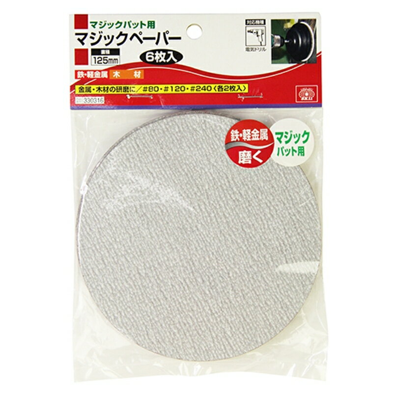 ペーパーとパットのマジックの間にわずかに空間ができ、研磨熱が放出され、長持ちします。■■■用途■■■木工製品の木地研磨・塗装研磨、金属製品の塗装研磨・サビ落とし等。■■■機能・特徴■■■マジックテープ式で脱着簡単繰り返し使用可能です。■■■仕様■■■●サイズ:(直径)125mm。●セット内容:80x2枚・120x2枚・240x2枚。●対応機種:電気ドリル。●マジックパット用。■■■注意事項■■■保護具を着用してください(マスク、保護メガネ等)。ゆるみが無いようにしっかりと取り付けてください。回転中は絶対に手や顔を近づけないでください。商品説明■■■用途■■■木工製品の木地研磨・塗装研磨、金属製品の塗装研磨・サビ落とし等。■■■機能・特徴■■■マジックテープ式で脱着簡単繰り返し使用可能です。■■■仕様■■■●サイズ:(直径)125mm。●セット内容:80x2枚・120x2枚・240x2枚。●対応機種:電気ドリル。●マジックパット用。■■■注意事項■■■保護具を着用してください(マスク、保護メガネ等)。ゆるみが無いようにしっかりと取り付けてください。回転中は絶対に手や顔を近づけないでください。※ページ記載の内容については予告なく変更する場合があります。ご了承下さい。メール便対応商品です。◆追跡サービス◆ 差し出しからお届けまでの配送状況をご確認頂けます。◆配達方法◆ 宅配便:対面受渡もしくは宅配ボックス等となります。 メール便:お届け先の郵便受けに配達致します。◆配達日◆ 宅配便:日曜・祝日等でも配達可能です。 メール便:日曜・祝日は原則配達されません。◆お届けまでの日数◆ 宅配便:おおむね発送日から1~2日前後でお届け致します。 メール便:おおむね発送日から2~5日前後でお届け致します。 但し、お届け先が遠方の場合や離島などの一部地域の場合など、 さらに数日要する場合が御座います。 お急ぎの場合は宅配便をご利用下さい。※メール便注意事項※■郵便受けに配達されるため代金引換はご利用頂けません。■翌日配送サービスには対応しておりません。また、配達日時指定も出来ません。■メール便対応商品を複数ご購入頂いた場合や、メール便対応外商品と同梱での発送の場合、 宅配便で発送する場合が御座いますので、予めご了承下さい。※メール便の場合の返品交換について※■配達中の商品破損、紛失があった場合でも保証、交換等は対応致しかねます。万が一、ご購入商品と違った商品が届いた場合には交換対応させて頂きます。