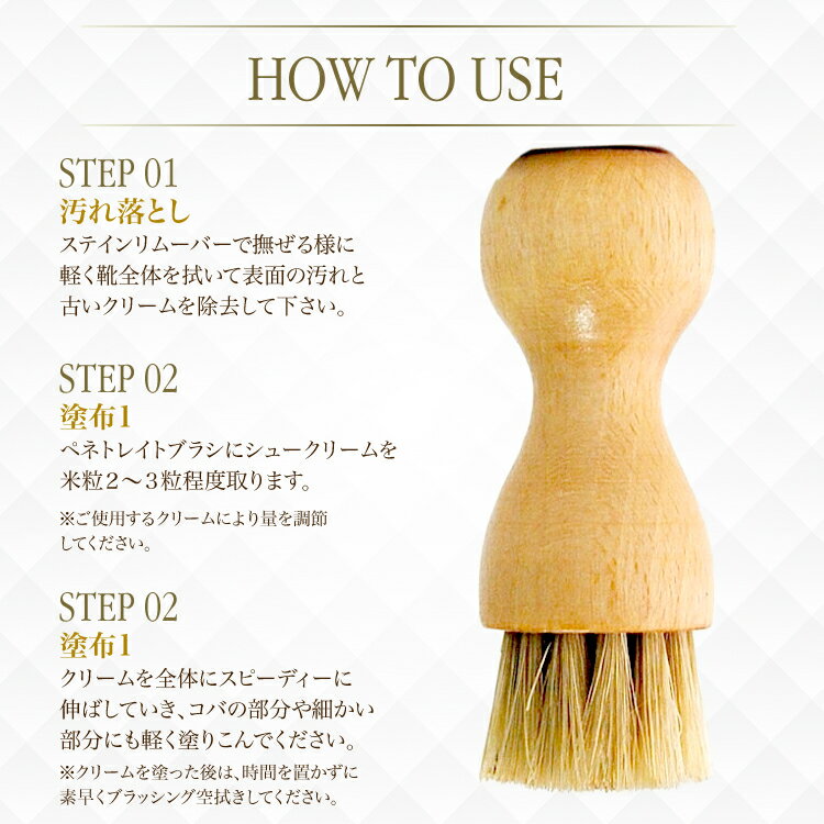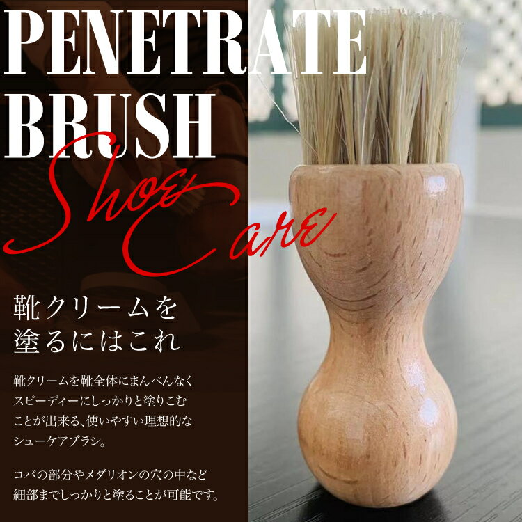 靴クリームをブラシで塗る。本当に理想的なブラシ。 靴のお手入れにはなくてはならない存在。 ●なんといってもペネトレィトブラシなら靴クリームを靴全体にまんべん無く塗りこむことができます。 布やスポンジの場合、クリームの水分が布に吸収されてしまい適量を塗ることができません。 また布では届かない、コバの部分やメダリオンの穴の中、繊維の中など細部までしっかりと塗ることができます。 ●手が汚れず素早く塗り広げられ、クリームが靴につきすぎる心配がありません。 ●少量の靴クリームで済みます。ビンの奥底のクリームもきれいに取ることができます。 ●そして形がとてもいい。使用してない時は立てておけるので、周りを靴クリーム等で 汚す心配も少なく、またブラシの毛も型崩れしにくいです。 ■ご注意■ 天然の木を使用しているため、画像の色と商品の色が異なる場合がございます。 ご了承の上、ご注文をお願い致します。