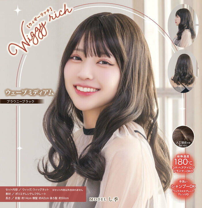 楽天スーパーSALE対象 期間限定 ウィッグ WIGGY RICH ウェーブミディアム ブラウニーブラック 耐熱ファイバー 推し インスタ映え