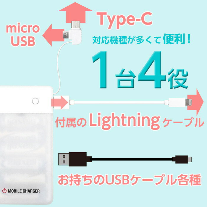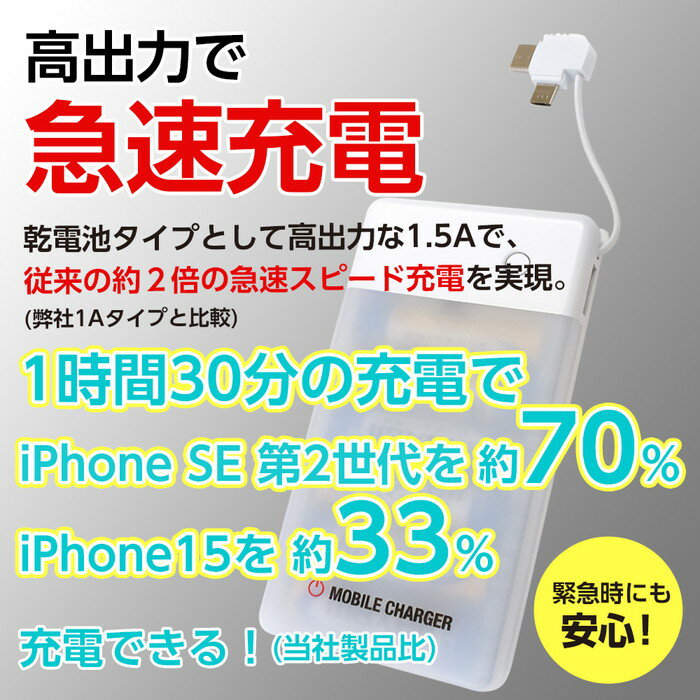 【商品説明】 乾電池で緊急充電! 1台4役+LEDライト [Lightning] [Type-C] [microUSB] [USB out] 緊急時や災害時に便利な6本タイプのスマホ用充電器です。 高出力1.5Aで、弊社1Aタイプに比べ約2倍のスピード充電を実現。 ※1時間30分の充電でiPhoneSE(第2世代)を約70%〜iPhone15を約33%充電 収納式マルチコネクターケーブル(microUSB+Type-C) 搭載により、これ 1台で様々なスマートフォン充電に対応。 Lightningケーブル付属でiPhone5以降に対応。 停電などの緊急時に大変便利なLEDライト搭載。 ■ アルカリ第3電池6本付 ■ Type-C・microUSB マルチケーブル ■ Lightningケーブル付 ■ USBポート付 ■ LEDライト付 ■ 高出力1.5A 出力:[Type-C・microUSB] 5V/1.5A(最大) [USB-A※] 5V/1.5A(最大) ※付属充電ケーブルを接続させたLightningも同様。 サイズ:約W63.5×D19×H120mm 重量:約67g (乾電池除く) 付属充電ケーブル:[コネクター形状] USB-Type-A to Lightning (約10cm) パッケージサイズ:約W94×D23.5×H182mm パッケージ込重量:約242.5g 素材PC 関連キーワード: 乾電池式 モバイルバッテリー 充電器 乾電池 電池 ライトニングケーブル USB ポート iPhone android アイフォン アンドロイド ライトニング ケーブル スマホ充電 スマホ 充電 Lightningケーブル 4本 アルカリ 単3 持ち運び 持ち歩き 外出時 災害 避難 防災 災害グッズ 災害用品 防災用品 防災グッズ 避難用品 避難グッズ【商品説明】 乾電池で緊急充電! 1台4役+LEDライト [Lightning] [Type-C] [microUSB] [USB out] 緊急時や災害時に便利な6本タイプのスマホ用充電器です。 高出力1.5Aで、弊社1Aタイプに比べ約2倍のスピード充電を実現。 ※1時間30分の充電でiPhoneSE(第2世代)を約70%〜iPhone15を約33%充電 収納式マルチコネクターケーブル(microUSB+Type-C) 搭載により、これ 1台で様々なスマートフォン充電に対応。 Lightningケーブル付属でiPhone5以降に対応。 停電などの緊急時に大変便利なLEDライト搭載。 ■ アルカリ第3電池6本付 ■ Type-C・microUSB マルチケーブル ■ Lightningケーブル付 ■ USBポート付 ■ LEDライト付 ■ 高出力1.5A 出力:[Type-C・microUSB] 5V/1.5A(最大) [USB-A※] 5V/1.5A(最大) ※付属充電ケーブルを接続させたLightningも同様。 サイズ:約W63.5×D19×H120mm 重量:約67g (乾電池除く) 付属充電ケーブル:[コネクター形状] USB-Type-A to Lightning (約10cm) パッケージサイズ:約W94×D23.5×H182mm パッケージ込重量:約242.5g 素材PC