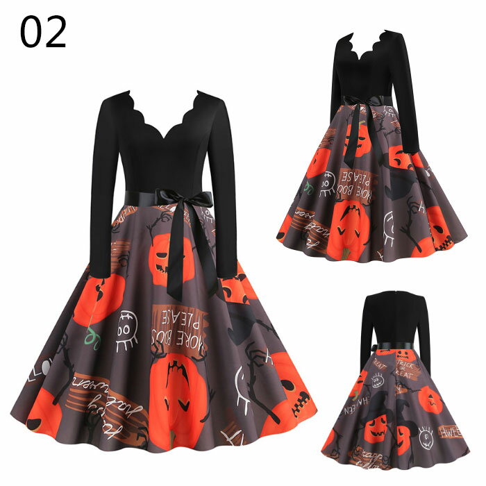 ワンピース ハロウイン衣装 舞台衣装 コスプレ 全6色 大きい裾ドレス レトロドレス Vネック 長袖 リボン付 ハロウイン 仮装 コスチューム ステージ衣装 コスプレ衣装 ダンス衣装 団体服 マスカレード 髑髏 花柄 幽霊 かぼちゃ カボチャ 文化祭 イベント パーティー 可愛い