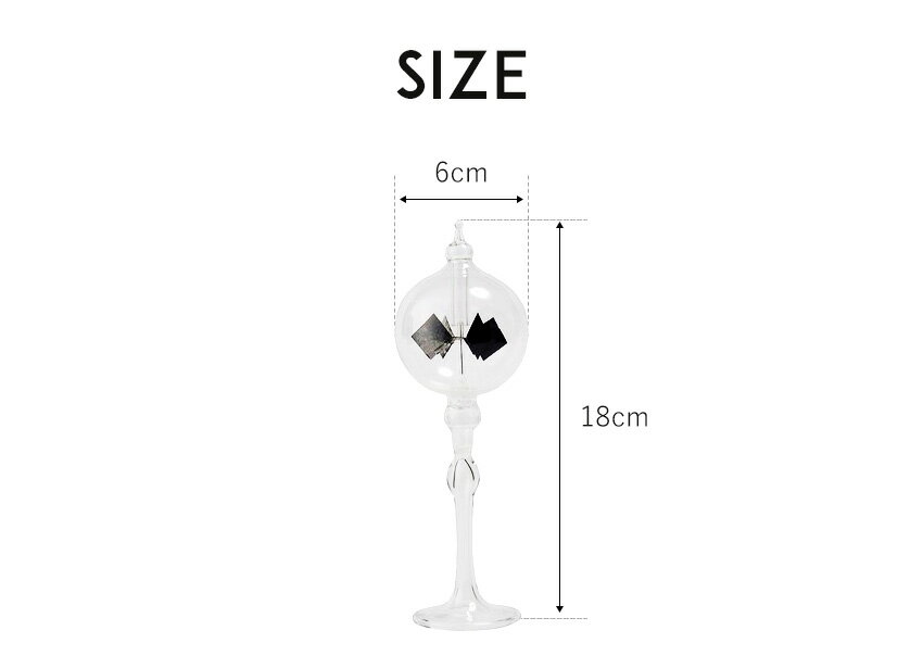 ご希望の方は>>こちらのページから「ラッピング」を 買い物カゴに入れてご注文願います。ラジオメーターは光熱に照らされると、ガラス内の羽がクルクルと回る不思議なオブジェ。1870年代に英国人・物理学者クルックスによって考案されたソーラーエネルギーを運動エネルギーに変える実験器具で、光の強さによって回転スピードが変化します。その独特な美しい造形はインテリアアイテムとして高い人気を誇ります。心を癒してくれる不思議なガラス工芸品として、玄関先や出窓などでお楽しみ下さい。 ラジオメーター シングル ラジオメーターは光熱に照らされると、ガラス内の羽がクルクルと回る不思議なオブジェ。 1870年代に英国人・物理学者クルックスによって考案されたソーラーエネルギーを運動エネルギーに変える実験器具。 光熱に照らされるとガラス内の4枚の羽根が回転し、窓辺に置けば太陽光で、室内にあれば白熱灯などに反応して回転し続けます。 光の強弱に比例して回転する速度が変化し、光が強いと回転する速度が上がります。 その独特な美しい造形はインテリアアイテムとして高い人気を誇ります。 心を癒してくれる不思議なガラス工芸品として、玄関先や出窓などでお楽しみ下さい。 当店では有料にて種類豊富なギフト用ラッピングも承れます。 大切なかたへのギフトにぴったりのお品物をスタッフが心を込めてお包みいたします。 ラッピング・お熨斗対応。>>こちら 関連商品 ラジオメーターふくろう ストームグラスしずく ストームグラスクラウド ストームグラスドーム ストームグラスボトル サイズ・重量 本体:約Φ6×高さ18cm/約45g BOXサイズ:約10.5×10.5×高さ23cm 材質・成分 ホウケイ酸ガラス、アイアンほか 内容 ラジオメーター 1点 注意事項 蛍光灯やネオン灯には反応しないため、太陽光や白熱灯に当たる場所でお楽しみください。 羽根の片側は黒くなっておりその破片がガラス球の中に落ちてしまうことがありますが、商品特性の一部となりますので予めご了承願います。 ハンドメイド品の為、ガラスの形状やサイズに個体差が生じる場合がございます。 本製品を使用した事による、直接的もしくは間接的に生じた損害・破損については弊社では責任・保証を負いかねます。 以下の点がみられる場合がございますが、運搬・材質・製造工程上避けられないものとなりますので予めご了承願います。 箱のつぶれ/多少の傷や擦れ/形状/サイズ/重さ/色合い等の若干の違い