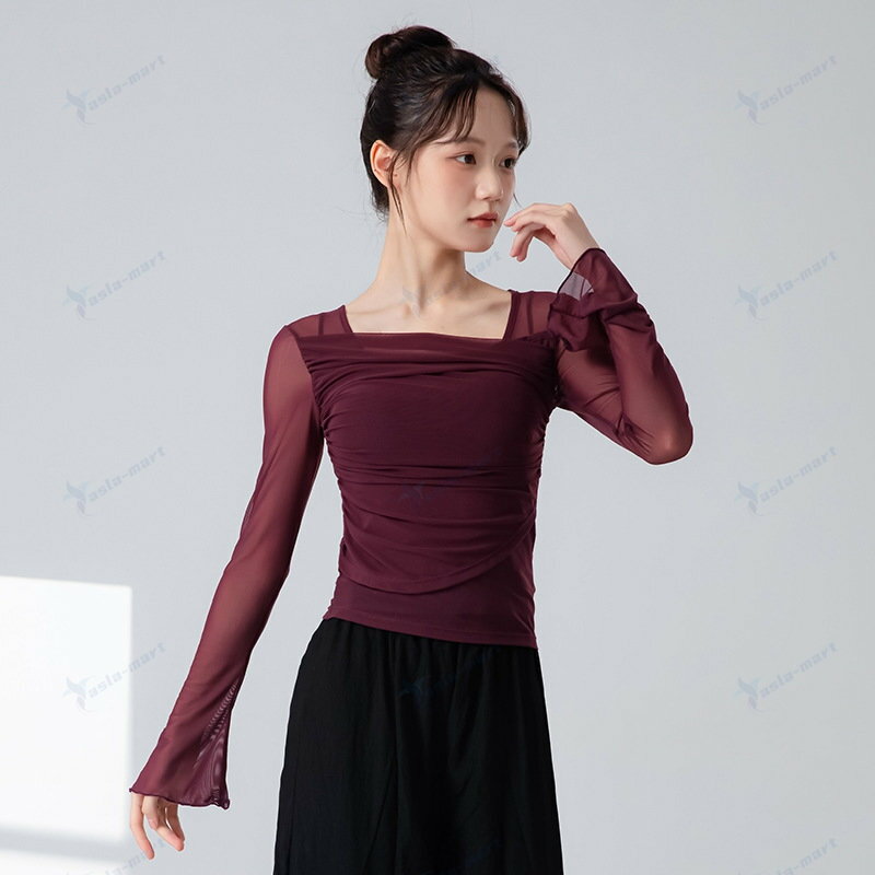 レディース ダンストップス 新作 現代舞 古典舞 中国舞 練習着 スリムフィット フレアスリーブ ギャザー袖 デザイン トップス 代舞 舞台衣装 発表会 演出用 練習用 おしゃれ 快適 大人用 ヨガウェア プラティ用