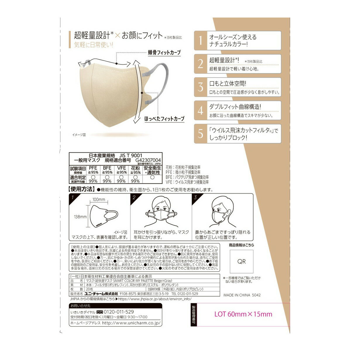【送料込・まとめ買い×5個セット】ユニ・チャーム 超快適 スマートカラー SMARTCOLOR MyPalette Beige×Gray ベージュ& グレー ふつう 20枚入 マスク
