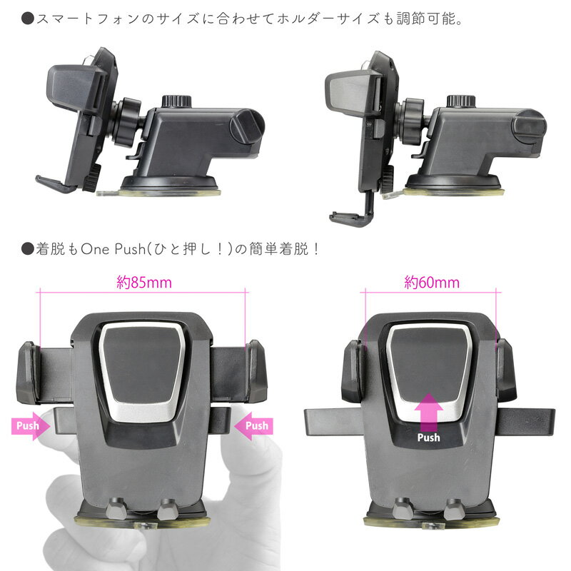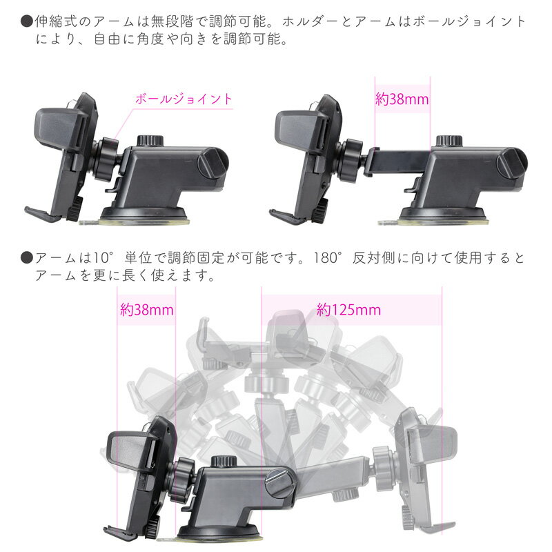 ■スマートフォンホルダー SMH-005様々なスマートフォンホルダーがある中で、なぜオススメなのか?なぜ売れているのか? 【まずはホルダーをしっかり固定】 色々なホルダーを使ってきたことのある方であれば、分かって頂けると思います。 まず、ダッシュボードは樹脂製ですが、平面は少なく、樹脂を安っぽく見せないために、革調のエンボス(凸凹)模様が入っているお車がほとんどです。 そういった場所には、従来の吸盤は吸着することが出来ず、両面テープが付いたベースプレートを接着してから吸盤で固定するといった苦肉の策で対応してきました。 しかしながらこの商品の吸盤はゲル吸盤!密着面はゲル状の柔らかい素材で粘着力もあり、粘着料・密着力・吸引力の3つの力で強力に吸着します。多少の凹凸は全く関係なく密着しする新素材の吸盤です。 【欲しい位置にスマホを固定】 次に設置場所からのスマートフォンのいち調整です。これは、ホルダーが設置可能なダッシュボードの位置からアームを伸ばしてスマートフォンを固定する位置にどれだけの自由度があるかです! コンパクトでスマートなスマートフォンホルダーは、単品で見ると機能的に見えますが、近年のお車でダッシュボードのホルダー設置位置にホルダーを固定し、スマートフォンをホールドすると人からスマートフォンの距離が遠くなるお車が非常に多いです。 スマートフォンがうまくホールドされていても、画面確認やスマホ操作をする際に前かがみになってスマートフォンへ近づかないと何も出来ないほどの距離。。。使い勝手が悪いですよね? もちろん運転中に操作や画面確認は出来ないですが、停車する度に操作される方にとってはストレス!そこでこのホルダーのロングアーム構造が性能を発揮します。【シンプル イズ ベスト】 これで良い!これが良い!のシンプル構造!このスマートフォンホルダーは難しい機械構造や非接触充電等の機能はございません。潔く壊れる要素の排除しております。 弊社のテストで自動開閉機能が付いたものや充電機能が付いたものを長年テストしましたが、平均2年以内に壊れる結果が出ました。もちろん世界中の全ての商品を検証したわけではございませんが、比較的商品価格の高い日本メーカー製でも壊れる物が非常に多かったです。原因は車内の環境にざいます。夏はかなり高温になり、熱や紫外線の影響を受けやすい車内は樹脂劣化早く、自動開閉のギヤが割れたり、非接触樹電機の基盤が駄目になったり、様々なトラブルが起きます。本当に必要な基本的な機能だけを追求してこのホルダーは出来上がりました。 【片手で脱着】 最後に、スマートフォンを脱着する際に手間取るホルダーは非常にストレスを感じます。 このホルダーは置くと自動でホールド!外したいときは片手で解除ボタンを押すだけ!どちらの操作も片手でスムーズに行えます。(ストレスフリー) ※ゲル吸盤の粘着力面が汚れて粘着力が弱まった場合は、水で洗い流すと粘着力が復活します! 素材 ・ABS樹脂 セット内容 ・本体×1 ※装着予定の車輛の取付け位置やスペースを確認してからご購入下さい。 ダッシュボードやガラス面。(設置する面を脱脂・洗浄してから貼付けて下さい。) ■各部の角度や長さの調整はネジを緩めてから行ってください。固定状態で各部を動かすと破損の原因となります。 ■輸入品により運送中に付く傷や打痕が有る場合がございます。 ■予告なく商品の仕様が一部変更となる場合がございますので、ご了承ください ■設置面は汚れを取り除き、脱脂してから設置してください。これを行わないと走行中に脱落し危険な場合ございます。 ■スマートフォンを走行中に注視・操作しないでください。道路交通法違反となります。 ■いかなる場合においても分解・改造は施さないでください。製品保証が適応されなくなります。