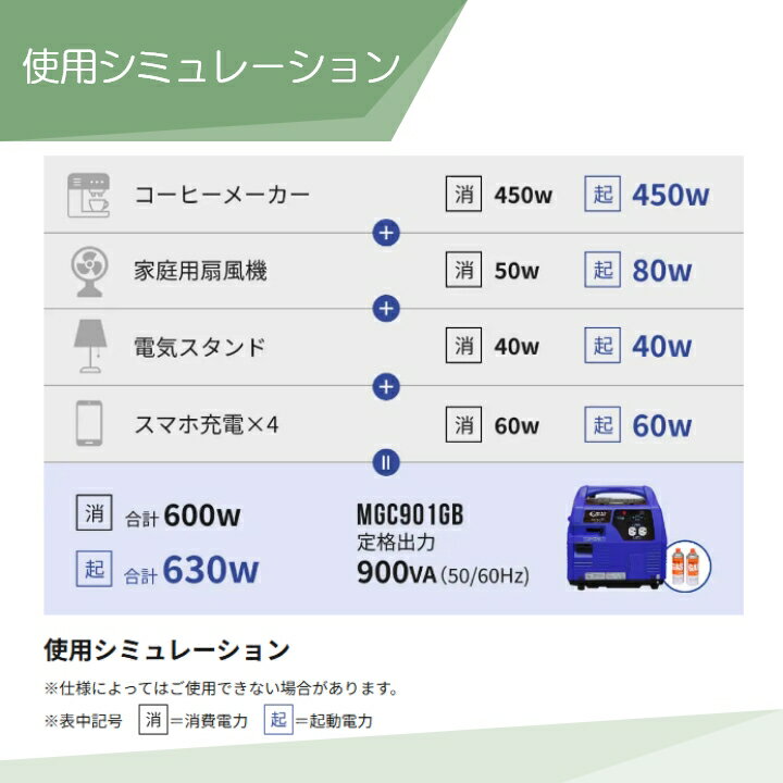 アースパワー 発電機 MGC901GBB11 カセットボンベ式 キャスター付 仕様 ・発電機 形式:多極回転界磁形単相交流インバーター発電機 励磁方式:自己励磁式 電圧調整方式:インバーター方式 定格周波数[Hz]:50/60切替式 定格出力:交流[ kVA]:0.9 直流[ W]:100 定格電圧:交流[ V ]:100 直流[V]:12 電流 交流[A]:9 直流[A]:8.3 出力端子 交流: 2-アース式コンセント 直流: 1-陸式ターミナル 力率:1 交流/直流電流保護装置:ー ・エンジン 名称:GM082 形式:空冷4サイクルOHVガスエンジン 総排気量cm3:79.6 使用燃料:ブタンガス(カセットボンベ)※1 使用温度範囲℃:10〜40※2 燃料タンク容量L:500g(ボンベ2本) 連続運転時間(1/4負荷〜定格負荷)h:約1.6〜1.0 使用潤滑油:エンジンオイルSAE10W-30 API分類SE級以上 潤滑油容量L:0.4 スパークプラグ:BPR6HS 始動方式:リコイル式 調速方式:ー ・その他 騒音レベルdB/LWA:91 (3/4負荷時)※3 寸法(全長×全幅×全高)[ mm]:400×330×390 乾燥質量[kg]:22 オイルセンサー:付 ※ 1 岩谷産業(株)のカセットガスをご使用ください。 ※ 2 MGC901GB の使用可能外気温は10℃? 40℃です。10℃未満では燃料の特性上、使用できない場合があります。 ※ 3 ISO3744に準ずる試験環境における音響パワーレベルの測定値です。 ウィルビー 発電機 家庭用電源 発電機 アースパワー インバーター 電機 精密機器 パソコン対応 イベント 日曜大工 電気 軽量 コンパクト 電源電源 非常時 避難 Willbe EarthPOWERインバーター発電機 動力 カセットボンベ カセットボンベ プロパンガス プロパンガス プロパンガス プロパンガス 型番 MGC901GBA11 MGC901GBB11キャリー付 MGC901GPA11 MGC901GPB11キャリー付 MGC2200GA02 MGC2200GAOE メーカー アースパワー アースパワー アースパワー アースパワー アースパワー アースパワー 定格出力(交流) 0.9KVA 0.9KVA 0.9KVA 0.9KVA 2.2KVA 2.2KVA 重量 22kg 22kg 20kg 20kg 56kg 61kg
