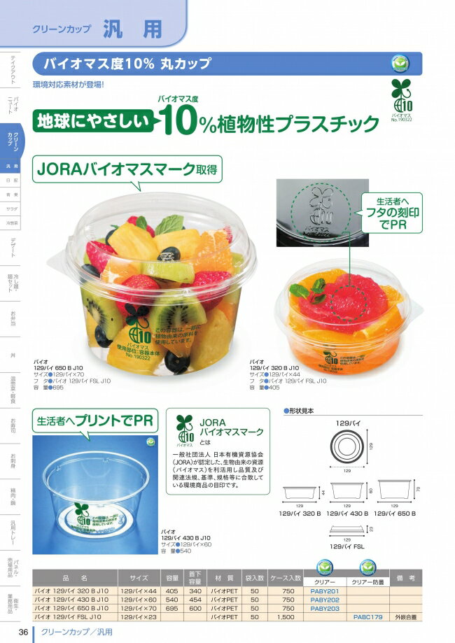 サイズ:129パイ×60mm容量:540(首下容量454)材質:バイオPET入数:750(50×15袋) 商品説明素材:バイオPET耐熱性:60℃耐寒性:△耐油性:〇保温性:×特徴:透明・一部植物由来備考:日配・サラダ・フルーツ・冷し麺・冷総菜・お寿司・お刺身※取り寄せ商品の為、キャンセルや返品はお受けできません。