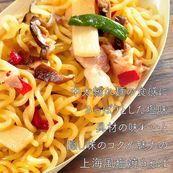 焼きそば 上海風塩焼そば焼きそば 上海風塩焼そばは野菜やしいたけの味や風味と豚肉の旨味の程よい塩味♪ お子様 にもおすすめ♪ お弁当のおかず お夜食 夕食 ランチ 昼食 パーティー 家族団らんのひと時にぜひご活用ください! ☆★☆おすすめシーン☆★☆ 居酒屋 レストラン 食堂 お弁当屋さん カラオケ店 学園祭 移動販売 模擬店 ゴルフ場 喫茶店あっさりとした塩味に、食酢と紹興酒を隠し味に加えて味に奥行きを出しました。 味と具材がからみやすい、もちもち食感の中太縮れ麺を使用して本格的な食べ応えをお楽しみいただけるようにまとめあげました。 ■調理方法:湯煎/電子レンジ ○電子レンジの場合凍ったままの商品を蒸気口の表示面を上にして耐熱性の容器にのせ、1袋につき500W3分10秒、600W2分30秒、1400W1分を目安に加熱してください。 ○湯煎の場合沸騰したたっぷりのお湯に、凍ったままの商品を袋ごと入れ、約8分間温めてください。 ■内容量:1食(200g) ■名称:焼そば(調理済み) ■原材料:めん(小麦粉、食塩/加工デンプン、かんすい、クチナシ色素)、野菜(赤ピーマン、たけのこ、さやいんげん)、豚肉、食酢、しょうゆ、粉末水あめ、砂糖、植物油、粉末状混合調味料(小麦・大豆・鶏肉・豚肉を含む)、老酒、乾しいたけ、香味食用油、液状混合調味料、食塩、ラー油(ごまを含む)/調味料(アミノ酸等)、増粘剤(タマリンドガム)、カラメル色素、香辛料抽出物、いため油(なたね油、大豆油) ■栄養成分表示(1食当たり・推定値):エネルギー384kcal、たんぱく質10.2g、脂質12.2g、炭水化物55.6g、食塩相当量3.4g ■賞味期限:パッケージに記載 ■保存方法:【要冷凍】-18℃以下で保存してください。 ■凍結前加熱の有無:加熱してありません。 ■加熱調理の必要性:加熱してお召し上がりください。 ■製造者:日東ベスト株式会社