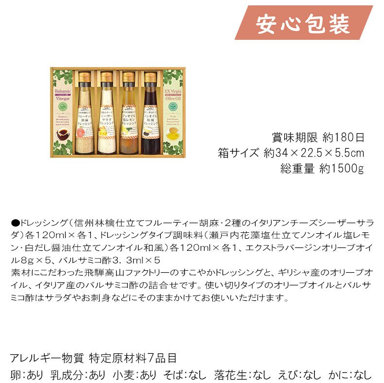 ●ドレッシング(信州林檎仕立てフルーティー胡麻・2種のイタリアンチーズシーザーサラダ)各120ml×各1、ドレッシングタイプ調味料(瀬戸内花藻塩仕立てノンオイル塩レモン・白だし醤油仕立てノンオイル和風)各120ml×各1、エクストラバージンオリーブオイル8g×5、バルサミコ酢3.3ml×5 素材にこだわった飛騨高山ファクトリーのすこやかドレッシングと、ギリシャ産のオリーブオイル、イタリア産のバルサミコ酢の詰合せです。使い切りタイプのオリーブオイルとバルサミコ酢はサラダやお刺身などにそのままかけてお使いいただけます。 箱サイズ 約34×22.5×5.5cm 総重量 約1500g 賞味期限 約180日 アレルギー物質 特定原材料7品目 卵:あり 乳成分:あり 小麦:あり そば:なし 落花生:なし えび:なし かに:なし ■さまざまなギフトアイテムをご用意しております。 お気軽にお問い合わせください。 内祝 内祝い お祝い返し ウェディングギフト ブライダルギフト 引き出物 引出物 結婚引き出物 結婚引出物 結婚内祝い 出産内祝い 命名内祝い 入園内祝い 入学内祝い 卒園内祝い 卒業内祝い 就職内祝い 新築内祝い 引越し内祝い 快気内祝い 開店内祝い 二次会 披露宴 お祝い 御祝 結婚式 結婚祝い 出産祝い 初節句 七五三 入園祝い 入学祝い 卒園祝い 卒業祝い 成人式 就職祝い 昇進祝い 新築祝い 上棟祝い 引っ越し祝い 引越し祝い 開店祝い 退職祝い 快気祝い 全快祝い 初老祝い 還暦祝い 古稀祝い 喜寿祝い 傘寿祝い 米寿祝い 卒寿祝い 白寿祝い 長寿祝い 金婚式 銀婚式 ダイヤモンド婚式 結婚記念日 ギフト ギフトセット セット 詰め合わせ 贈答品 お返し お礼 御礼 ごあいさつ ご挨拶 御挨拶 プレゼント お見舞い お見舞御礼 お餞別 引越し 引越しご挨拶 記念日 誕生日 父の日 母の日 敬老の日 記念品 卒業記念品 定年退職記念品 ゴルフコンペ コンペ景品 景品 賞品 粗品 お香典返し 香典返し 志 満中陰志 弔事 会葬御礼 法要 法要引き出物 法要引出物 法事 法事引き出物 法事引出物 忌明け 四十九日 七七日忌明け志 一周忌 三回忌 回忌法要 偲び草 粗供養 初盆 供物 お供え お中元 御中元 お歳暮 御歳暮 お年賀 御年賀 残暑見舞い 年始挨拶 話題 のし無料 メッセージカード無料 ラッピング無料 手提げ袋無料 大量注文●ドレッシング(信州林檎仕立てフルーティー胡麻・2種のイタリアンチーズシーザーサラダ)各120ml×各1、ドレッシングタイプ調味料(瀬戸内花藻塩仕立てノンオイル塩レモン・白だし醤油仕立てノンオイル和風)各120ml×各1、エクストラバージンオリーブオイル8g×5、バルサミコ酢3.3ml×5 素材にこだわった飛騨高山ファクトリーのすこやかドレッシングと、ギリシャ産のオリーブオイル、イタリア産のバルサミコ酢の詰合せです。使い切りタイプのオリーブオイルとバルサミコ酢はサラダやお刺身などにそのままかけてお使いいただけます。 箱サイズ 約34×22.5×5.5cm 総重量 約1500g 賞味期限 約180日 アレルギー物質 特定原材料7品目 卵:あり 乳成分:あり 小麦:あり そば:なし 落花生:なし えび:なし かに:なし 関連商品 DS?25すこやかドレッシング DS?20すこやかドレッシング DS?15すこやかドレッシングとオイル ID?6Xすこやかドレッシング ID?5Xすこやかドレッシング ID?4Xすこやかドレッシング ID?3Xすこやかドレッシング DR?22Rドレッシング2ホンセット DR?30Rドレッシング3ホンセット