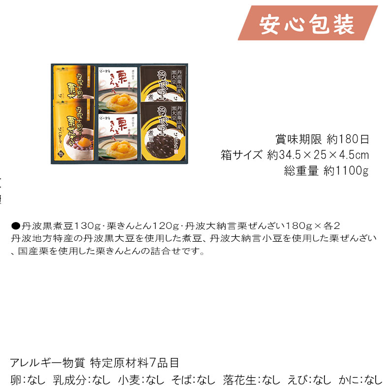 ●丹波黒煮豆130g・栗きんとん120g・丹波大納言栗ぜんざい180g×各2 丹波地方特産の丹波黒大豆を使用した煮豆、丹波大納言小豆を使用した栗ぜんざい、国産栗を使用した栗きんとんの詰合せです。 箱サイズ 約34.5×25×4.5cm 総重量 約1100g 賞味期限 約180日 アレルギー物質 特定原材料7品目 卵:なし 乳成分:なし 小麦:なし そば:なし 落花生:なし えび:なし かに:なし ■さまざまなギフトアイテムをご用意しております。 お気軽にお問い合わせください。 内祝 内祝い お祝い返し ウェディングギフト ブライダルギフト 引き出物 引出物 結婚引き出物 結婚引出物 結婚内祝い 出産内祝い 命名内祝い 入園内祝い 入学内祝い 卒園内祝い 卒業内祝い 就職内祝い 新築内祝い 引越し内祝い 快気内祝い 開店内祝い 二次会 披露宴 お祝い 御祝 結婚式 結婚祝い 出産祝い 初節句 七五三 入園祝い 入学祝い 卒園祝い 卒業祝い 成人式 就職祝い 昇進祝い 新築祝い 上棟祝い 引っ越し祝い 引越し祝い 開店祝い 退職祝い 快気祝い 全快祝い 初老祝い 還暦祝い 古稀祝い 喜寿祝い 傘寿祝い 米寿祝い 卒寿祝い 白寿祝い 長寿祝い 金婚式 銀婚式 ダイヤモンド婚式 結婚記念日 ギフト ギフトセット セット 詰め合わせ 贈答品 お返し お礼 御礼 ごあいさつ ご挨拶 御挨拶 プレゼント お見舞い お見舞御礼 お餞別 引越し 引越しご挨拶 記念日 誕生日 父の日 母の日 敬老の日 記念品 卒業記念品 定年退職記念品 ゴルフコンペ コンペ景品 景品 賞品 粗品 お香典返し 香典返し 志 満中陰志 弔事 会葬御礼 法要 法要引き出物 法要引出物 法事 法事引き出物 法事引出物 忌明け 四十九日 七七日忌明け志 一周忌 三回忌 回忌法要 偲び草 粗供養 初盆 供物 お供え お中元 御中元 お歳暮 御歳暮 お年賀 御年賀 残暑見舞い 年始挨拶 話題 のし無料 メッセージカード無料 ラッピング無料 手提げ袋無料 大量注文関連商品 TMV-S 丹波黒・松茸昆布 FS-33S 安田の佃煮 ふる里自慢 DK?30KRマルトモバラエティギフト TS-55佃煮の故郷から NA-50G 舞すがた卓上詰合せ 里-30N日本全国うまいものめぐり NA-40G 舞すがた卓上詰合せ MT-30ご飯のお供瓶詰セット NA-30G舞すがた卓上詰合せ 価格帯 5980円以下→ 商品ジャンル 珍味・漬物→