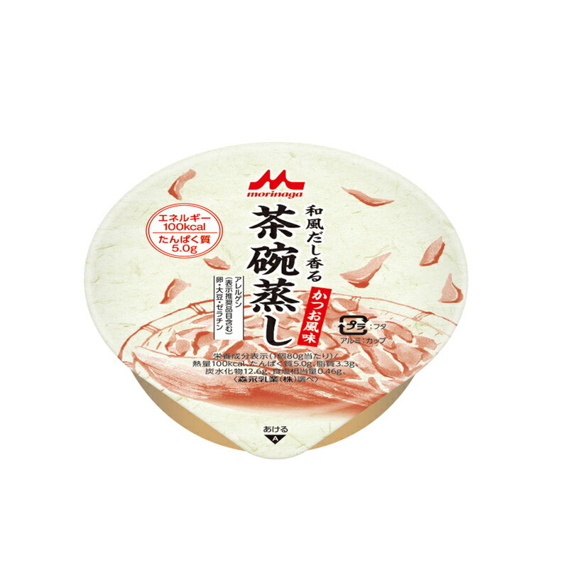 和風だし香る茶碗蒸し バラエティセット (80g×6種×各1 個) 和風だしの旨みと卵のやさしい舌ざわりの茶碗蒸し 毎日食べたくなるおいしさ 和風だしの旨みと卵のやさしい舌ざわりどこか懐かしい味わいです。 ・おかずの1品として。 ・甘いものが苦手な方に。 ・調理が難しい方に。 ※冷やしても温めてもおいしくお召し上がりいただけます! ※容器のまま湯せんでき、温かくしてお召し上がりいただけます。 70~80℃のお湯で10分が目安です。 ※湯せん後は容器と内容物が熱くなります。やけどにご注意ください。 ※容器はアルミ容器です。容器のまま電子レンジで加熱しないでください。 ※スチームコンベクションでも加熱できます。 食べやすい食感 かたいものが食べづらい方にも食べやすい食感です。 ・かむ力が落ちた方に。 ・ツルンとした食感がお好みの方に。 手軽に栄養補給 80gの食べきりサイズでエネルギー100kcal たんぱく質5.0g ・食事の一品として栄養補給したい方に。 長期保存できる 賞味期限 製造日より15ヶ月 ・災害備蓄食のローリングストックに。 選べるおいしさ かつお風味、ほたて風味、かに風味、ゆず風味、とり風味、まつたけ風味 ・きのこない6種類のラインアップ ■ 標準組成 1カップ 80g ラインナップ エネルギー たんぱく質 脂質 炭水化物 塩分相当量 かつお風味 100kcal 5.0g 3.3g 12.6g 0.46g ほたて風味 100kcal 5.0g 3.3g 12.6g 0.58g かに風味 100kcal 5.0g 3.3g 12.6g 0.46g ゆず風味 100kcal 5.0g 3.3g 12.6g 0.81g とり風味 100kcal 5.0g 3.3g 12.6g 0.69g まつたけ風味 100kcal 5.0g 3.3g 12.6g 0.74g ※食塩相当量(g)=ナトリウム(mg)×2.54×1/1000 ■ 原材料名: 【かつお風味】 でんぷん分解物、鶏卵、コラーゲンペプチド、かつお節調味液、植物油、寒天、昆布エキス/調味料(アミノ酸等)、ゲル化剤(増粘多糖類)、香料、(一部に卵・大豆・ゼラチンを含む) 【ほたて風味】 でんぷん分解物、鶏卵、コラーゲンペプチド、かつお節調味液、植物油、ほたてエキス、寒天/調味料(アミノ酸等)、ゲル化剤(増粘多糖類)、香料、(一部に卵・大豆・ゼラチンを含む) 【かに風味】 でんぷん分解物、鶏卵、コラーゲンペプチド、かつお節調味液、植物油、寒天/調味料(アミノ酸等)、ゲル化剤(増粘多糖類)、香料、(一部に卵・大豆・ゼラチンを含む) 【ゆず風味】 でんぷん分解物、鶏卵、コラーゲンペプチド、植物油、かつお節調味液、食塩、寒天/調味料(アミノ酸等)、ゲル化剤(増粘多糖類)、香料、(一部に卵・大豆・ゼラチンを含む) 【とり風味】 でんぷん分解物、鶏卵、コラーゲンペプチド、植物油、食塩、かつお節調味液、寒天/ゲル化剤(増粘多糖類)、調味料(アミノ酸等)、香料、(一部に卵・大豆・ゼラチンを含む) 【まつたけ風味】 でんぷん分解物、鶏卵、コラーゲンペプチド、植物油、かつお節調味液、食塩、寒天/ゲル化剤(増粘多糖類)、調味料(アミノ酸等)、香料、(一部に卵・大豆・ゼラチンを含む) ■ 原材料に含まれるアレルゲン(28品目中): 【かつお風味】卵・大豆・ゼラチン 【ほたて風味】卵・大豆・ゼラチン 【かに風味】卵・大豆・ゼラチン 【ゆず風味】卵・大豆・ゼラチン 【とり風味】卵・大豆・ゼラチン 【まつたけ風味】卵・大豆・ゼラチン ■ 保存方法:室温保存 (直射日光を避け、なるべく涼しい所で保管してください。) ■ 賞味期限:製造日より15ヶ月 ■ 使用上の注意 ・医師・栄養士等のご指導に従って使用してください。 ・卵・大豆・ゼラチン由来の成分が含まれています。アレルギーを示す方は使用しないでください。 ・容器に漏れ・膨脹等がみられるもの及び容器の破損しているものは使用しないでください。 ・開封時に内容物の色・臭い・味に異常があるものは使用しないでください。 ・製品により、若干の離水や気泡及び周囲の一部に褐色化が認められる場合もありますが、 品質には問題ありません。 ・開封後に全量使用しない場合には、直ちに冷蔵庫に保管し、その日のうちに使用してください。 ・室温で保存できますが、おいしさや品質を保つために冷暗所での保管をおすすめします。 ・直射日光があたる場所や、高温な場所、凍結するような場所で保管しますと、風味劣化等の 性状変化が認められる場合があります。