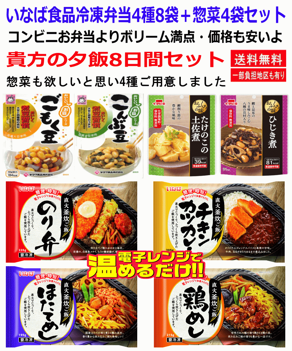 【SDGsへの取り組み】 弊社は資源の無駄をなくすという観点で代用箱を使い発送しています。ご協力よろしくお願いいたします。関東圏送料無料。一部有料エリアもあります。 缶詰め、カレーで人気のいなば食品から、冷凍お弁当が発売されました。今回取り組むことになりました。大変人気でよく売れています。 直火釜炊きのおいしいごはんをベースにチキンカツカレー、のり弁、ホタテめし、鶏めし8袋セット。ひたすらお弁当だけを食べるよりは、箸休めにお豆さん、惣菜などの栄養価の高いものも、同時に食べてください。惣菜は常温で食べても大変おいしいです。小皿なら山盛りの量です。お惣菜は画像3から4種ご用意します。 コンビニ弁当よりボリューム満点。コスパも最高。美味しさも抜群です。冷凍室に保存しておいてください。 小腹が減った!お夜食に。おむすびのお供に。大変便利なセットです。色んな味が楽しめるセット。賞味期限は数か月ありますので安心してください。 ストックしていてもフレーバが違うので毎日食べても飽きませんね。スーパーでもここまでは揃っていません。いろんな味が楽しめるセットです。ポチッで玄関まで届きます。 【お読みください】 ●関東圏送料無料。一部有料エリアもあります。 ●メーカー終売・在庫状況で画像通りにならない時もあります。予めご了承ください。 ●箱はあり合わせのの再利用箱です。資源活用にご理解ください。予めご了承願います。 ●代用箱を使ったときは、親和性のあるおまけを入れるようにしています。 ●非常時のお備えにも、災害食としても保管ください。食しながら追加し、保存食にお役立てください。 ●進物の場合はお申し出ください。のし包装はサービスです。要望欄にご連絡ください。お中元、お歳暮、ご挨拶の品、誕生日、お祝い、お礼などの、ご挨拶などの進物にもご対応します。 ●再利用箱に包装し、茶紙で包んで発送します。茶紙を剥がせば贈り物になります。 ●発送は平日で注文より3から4日後に発送します。お急ぎの場合は注文番号をメモの上お電話でご連絡ください。株式会社広島屋 078-994-4947迄【SDGsへの取り組み】 弊社は資源の無駄をなくすという観点で代用箱を使い発送しています。ご協力よろしくお願いいたします。関東圏送料無料。一部有料エリアもあります。 缶詰め、カレーで人気のいなば食品から、冷凍お弁当が発売されました。今回取り組むことになりました。大変人気でよく売れています。 直火釜炊きのおいしいごはんをベースにチキンカツカレー、のり弁、ホタテめし、鶏めし8袋セット。ひたすらお弁当だけを食べるよりは、箸休めにお豆さん、惣菜などの栄養価の高いものも、同時に食べてください。惣菜は常温で食べても大変おいしいです。小皿なら山盛りの量です。お惣菜は画像3から4種ご用意します。 コンビニ弁当よりボリューム満点。コスパも最高。美味しさも抜群です。冷凍室に保存しておいてください。 小腹が減った!お夜食に。おむすびのお供に。大変便利なセットです。色んな味が楽しめるセット。賞味期限は数か月ありますので安心してください。 ストックしていてもフレーバが違うので毎日食べても飽きませんね。スーパーでもここまでは揃っていません。いろんな味が楽しめるセットです。ポチッで玄関まで届きます。