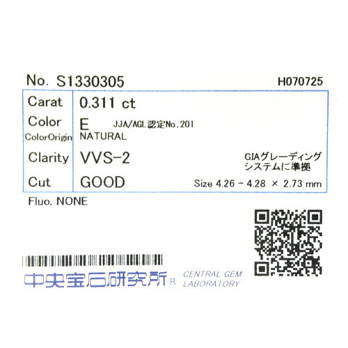 宝石 ダイヤモンド シェイプ ラウンドブリリアント カラット 0.311ct カラー E クラリティ VVS2 カット GOOD 蛍光性 N サイズ 4.26 - 4.28 × 2.73 mm 付属品 中央宝石研究所のソーティング※ご希望の方には中央宝石研究所のグレーディングレポート(鑑定書)を発行いたしますので、ご注文の際の選択欄で、グレーディングレポート(鑑定書)を「付ける」を選択ください(無料/納期2、3週間ほど)。 備考 ※宝石店(実店舗)にて販売中の商品です。間違いなく本物ですのでご安心ください。※ルースの商品画像はイメージ画像です。(色のイメージが違うという理由での返品は受け付けておりませんのでご注意ください。)※実物の画像をご覧になられたい場合はご注文前にお問い合わせください。+++++++++++++【代金引換について】お支払い代金が合計50万円以上になる場合は、代金引換での配達ができません。他のお支払い方法をご選択ください。 管理番号 lo0298