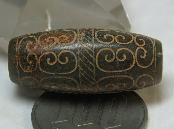 ■龍香堂■☆旧中国玉「彫入管玉(回紋珠)」30mm(yra4)