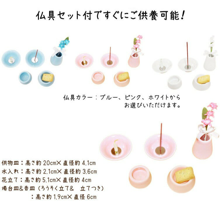 コンパクトで薄型、かわいい屋根の形のハウス型ミニ仏壇です。 L判フォトフレーム付きで、縦横両用でお使いいただけるので、かわいい写真を選んで飾っていただけます。 ☆大切な人を失ったあなたへ☆ 供養の方法は、人それぞれです。世界中にいろいろな宗教があるように供養の方法も星の数程あります。 大切なのは、あなたが亡くなった方への感謝の想いひとつです。 あの子を身近に感じながらいつも一緒に。沢山ご供養してください。 仏壇サイズ:W26.8×H27.5×D10.4cm 重量:約1,080g ステージ:W29×D21cm 供物皿:高さ約20cm×直径約4.1cm 水入れ:高さ約2.1cm×直径約3.6cm 花立て:高さ約5.1cm×直径約4cm(口径:2.6cm) 燭台皿&香皿(ろうそく立て&香立てつき):高さ約1.9cm×直径6cm ろうそく立て、香立ては取り外し可能です。 おりんサイズ:直径4.5cm 肉球マット:幅約8.5cm×縦約6.7cm×厚み約4mm りん棒:10.5cm 画像内の骨壷はイメージです。セット内容には含まれませんのでご注意ください。