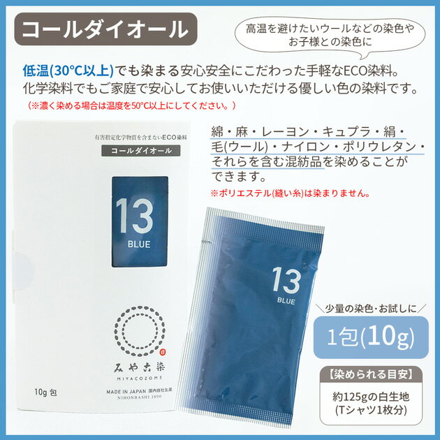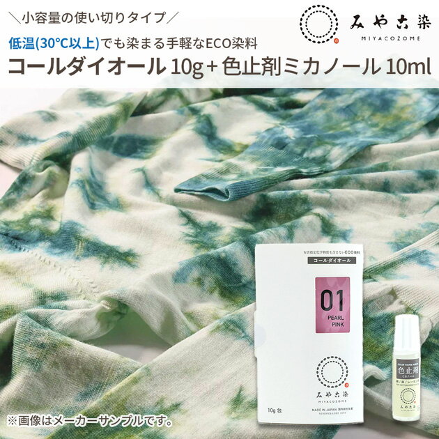 みやこ染 低温(30℃以上)で染まる ECO染料 コールダイオール 10g + 色止剤 ミカノール 10ml セット 全28色 ゆうパケット送料無料 ■ 安心 安全 小容量 使い切り 綿 麻 レーヨン キュプラ 絹 毛 ウール ナイロン ポリウレタン 染色 粉体 手作り ■