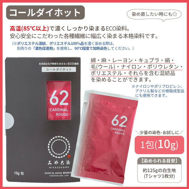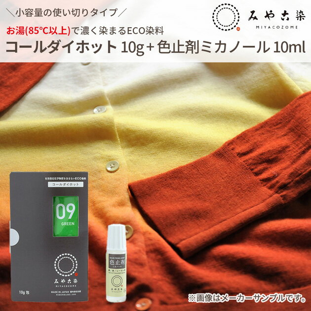 みやこ染 お湯(85℃以上)で濃く染まる ECO染料 コールダイホット 10g + 色止剤 ミカノール 10ml セット 全28色 ゆうパケット送料無料 ■ 安心 安全 小容量 使い切り 綿 麻 レーヨン キュプラ 絹 ウール ナイロン ポリエステル 染色 粉体 染料 ■