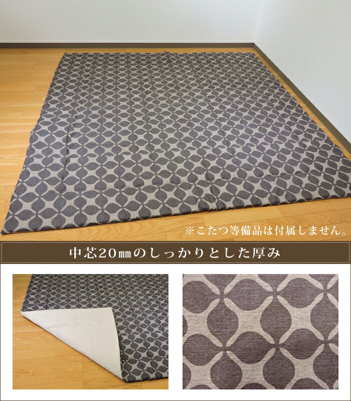 寒い季節の必須アイテムのこたつ用品。 眠り姫では豊富なサイズと種類を用意しております。 一つの柄で掛布団・敷布団・カバー・クッションまでトータルコーディネートが可能です。 統一感のあるお部屋が完成♪ (一部揃える事のできない柄もございます。) 【眠り姫のこたつ用品ラインナップ】 ・「軽いポリエステル仕様」〜「しっかりとした米綿仕様」の多様な「掛布団」 ・コンパクトでラグとしても使える「中敷き布団」 ・床冷えを防ぎ、座り心地の良い「敷布団」 ・違和感を感じにくい様、ファスナー部分にこだわった「カバー」 ・色柄豊富でどこにでも使える「マルチカバー」 ■商品説明 クッション性のあるポリエステル固綿を中芯に使用しています。畳みやフローリングの上でも快適にご使用いただけます。こたつ敷布団としてだけではなく、プレイマットやラグとして日常使いにもおすすめです。綿100%のしっかりした生地を使用し長くご使用いただけるこたつ布団です。ナチュラルな織物調の生地です。シックなブラウン・グレーと、お部屋が明るく見えるピンクとイエローの4色♪眠り姫で縫製・加工しています。 ■通常タイプスペック 【サイズ】195cm×195cm 正方形【側生地】表生地:綿100% オックス裏生地:綿100%(ベージュ)【中材】ポリエステル固綿芯20mm 2.0kg【原産国】日本製(生地・側縫製・加工) ■ボリュームタイプスペック 【生地】表生地:綿100% オックス/裏生地:ポリエステル【中芯】ポリエステル固綿芯20mm【中綿】ポリエステル 100% (帝人マイティトップII:抗菌防臭防ダニ加工・帝人フィルケア:洗える綿)【充填物量】約3.0kg(かた芯:約2.0kg/中綿:約1.0kg)【原産国】日本製(生地・側縫製・加工)【備考】・裏面滑り止め付(ポリエステル100%)・ヘム付き ■お手入れ 洗える資材を使用しておりませんので、クリーニング店等の専門の業者様へご依頼下さい。 ■ご確認ください ※この商品には、こたつ台はついていません。こたつ敷布団のみです。 ※モニターによって色の見え方が違います。 実際の色の確認をご希望の方は、カット生地(小)を送らせていただきます。 ご連絡ください。 ※モニターと色が異なる理由での返品は承る事ができません。 ※生地表面に黒い小さな点ある場合がございます。 使用しております素材本来の物であり汚れ等ではございません。 また、生地の表面上に凹凸がある事もございますが、糸の太さに微細な違いがある為に生じる凹凸となります。 綿100%本来の特徴となります為、ご了承くださいませ。 ※北海道、沖縄県、離島に関しましては別途追加送料をいただいております。 ご注文確認後、追加送料をご連絡させていただきます。