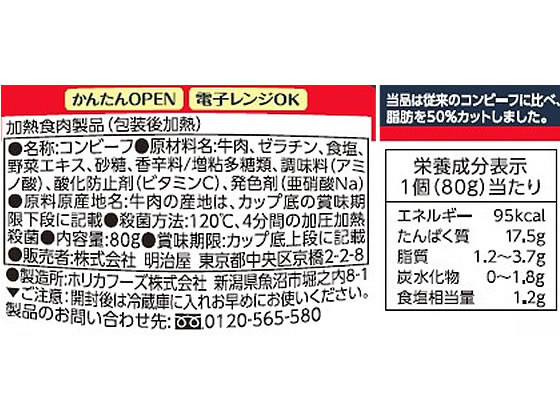【重要:ご注文について】お客様のご都合による商品の交換・返品・数量変更は一切承っておりません。ご注文の際は慎重にお選びの上、ご注文願います。■ご注文の個数によっては、表示の出荷日目安よりも出荷まで日数を頂く場合がございます。納期については、事前にお問い合わせをお願い致します。また、当該商品は他店舗でも在庫を共有しておりますので、在庫更新のタイミングにより在庫切れの場合、やむを得ずキャンセルさせて頂く可能性があります。【送料について】『同梱区分C : 988円(沖縄・離島 2420円)』※『異なる同梱区分の商品』を一緒にご注文頂いた場合は、同梱が出来ません。別配送となり追加送料がかかりますので、ご注文後に訂正の上、ご連絡させて頂きます。【ご注意】事前の配達日付は一切ご指定頂けません。配達日時につきましては、お手数ですが出荷完了時にご案内する荷物問い合わせ番号をもとに、お客様より配送業者へ直接御調整をお願い致します。メーカーによるリニューアルに伴い、パッケージ・内容等が予告なく変更される場合がございます。掲載写真等がリニューアル前のものであっても、リニューアル後の商品が届いた場合、ご返品や交換等は承ることが出来ません。置き配は破損・汚損・紛失・盗難などの恐れがあるため、原則としてお断りしております。置き配による破損・汚損・紛失・盗難については保証ができかねますので、あらかじめご承知おきください。脂肪の少ないコンビーフスマートカップ 80g 3連パック 明治屋健康を考えた脂肪無添加のコンビーフです。牛の赤身肉を使用しています。メーカー従来品にくらべ脂肪分を約50%カットしています。すぐに開けられて、長期保存も可能な新容器スマートカップ。電子レンジでも温められて便利です。●注文単位:1パック(3個)※メーカーの都合により、パッケージ・仕様等は予告なく変更になる場合がございます。●広告文責:株式会社プロヴィジョン(tel:092-985-3973)