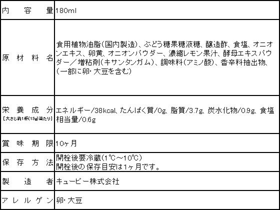 【重要:ご注文について】お客様のご都合による商品の交換・返品・数量変更は一切承っておりません。ご注文の際は慎重にお選びの上、ご注文願います。■ご注文の個数によっては、表示の出荷日目安よりも出荷まで日数を頂く場合がございます。納期については、事前にお問い合わせをお願い致します。また、当該商品は他店舗でも在庫を共有しておりますので、在庫更新のタイミングにより在庫切れの場合、やむを得ずキャンセルさせて頂く可能性があります。【送料について】『同梱区分C : 988円(沖縄・離島 2420円)』※『異なる同梱区分の商品』を一緒にご注文頂いた場合は、同梱が出来ません。別配送となり追加送料がかかりますので、ご注文後に訂正の上、ご連絡させて頂きます。【ご注意】事前の配達日付は一切ご指定頂けません。配達日時につきましては、お手数ですが出荷完了時にご案内する荷物問い合わせ番号をもとに、お客様より配送業者へ直接御調整をお願い致します。メーカーによるリニューアルに伴い、パッケージ・内容等が予告なく変更される場合がございます。掲載写真等がリニューアル前のものであっても、リニューアル後の商品が届いた場合、ご返品や交換等は承ることが出来ません。置き配は破損・汚損・紛失・盗難などの恐れがあるため、原則としてお断りしております。置き配による破損・汚損・紛失・盗難については保証ができかねますので、あらかじめご承知おきください。フレンチドレッシング(白)180ml キューピーコールスローやサラダによく合います。手作りドレッシングのベースとしてもお使いいただけます。2〜3人世帯向けです。●内容量:180ml※メーカーの都合により、パッケージ・仕様等は予告なく変更になる場合がございます。●広告文責:株式会社プロヴィジョン(tel:092-985-3973)