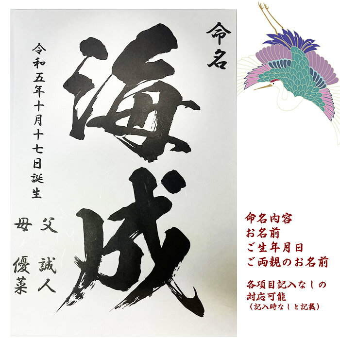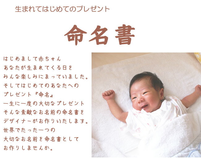 はじめまして赤ちゃんあなたが生まれてくる日を みんな楽しみにまっていました。 そしてはじめてのあなたへの プレゼント『命名』 一生に一度の大切なプレゼント そんな素敵なお名前の命名書を デザイナーがお作りいたします。 世界でたった一つの 大切なお名前を命名書として お作りしませんか。 和紙タイプの高級仕様 サイズA4和紙タイプ(メール便対応) プリント仕様(業務用カラープリンター仕様) 命名書は+200円で1枚追加できます。追加とは?→同じデザインのものをプリントするサービスです。価格はデザイン複製代のみです※送料につきまして配送方法により送料が変わります。お客様のカートにお入れいただく際に配送方法をお選びいただけますのでそちらよりご選択くださいませ。 メール便対応商品の場合も宅配便を選択して購入されますと宅配便出荷となり宅配便送料となりますのでご注意くださいませ。